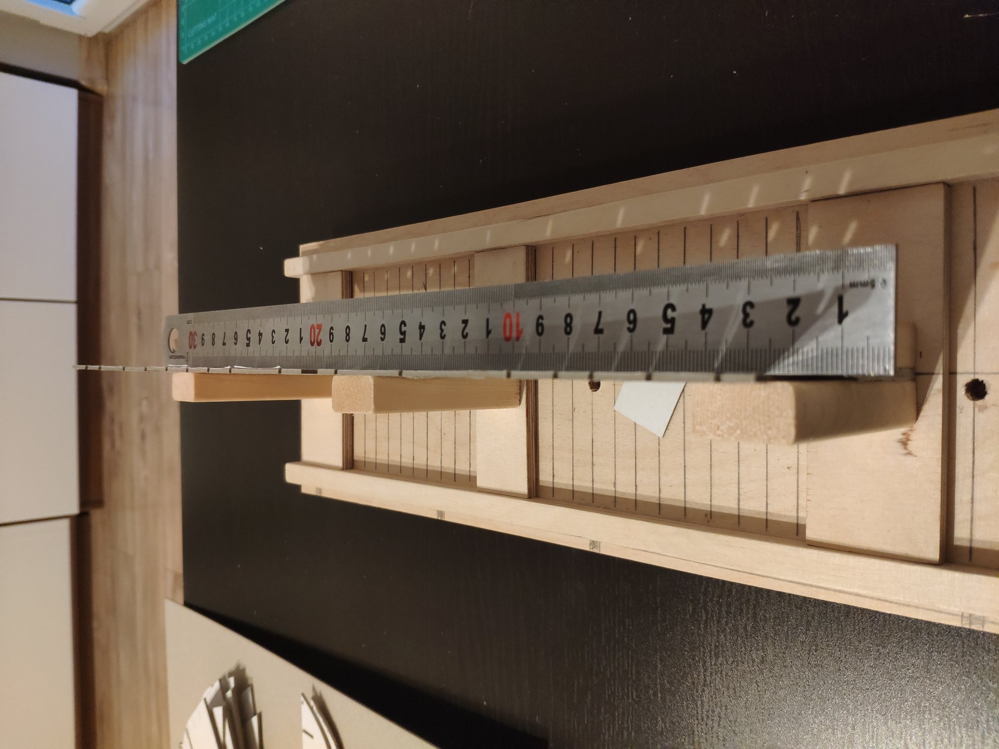 To zeszlifowanie powinno być na całej długości wodnicy, Wręgi również powinny być zeszlifowane. Od środkowej w kierunku dziobu w stronę lewej krawędzi wręgi. Od środkowej w kierunku rufy w stronę prawej krawędzi wręgi. Rysunki powiększyłeś do 1:69 więc zwiększyła się też grubość kreski. Podczas wycinania trzeba przyjąć zasadę: tniemy tak aby linii nie było widać wcale, albo po prawej krawędzi linii. Ma to znaczenie przy grubszych liniach, przy cienkich nie. Ten szkielet ma skrzywienie podłużnicy w części dziobowej, wiec jest do wyrzucenia. Chyba, że potrafisz to umiejętnie rozkleić i ponownie skleić prosto.