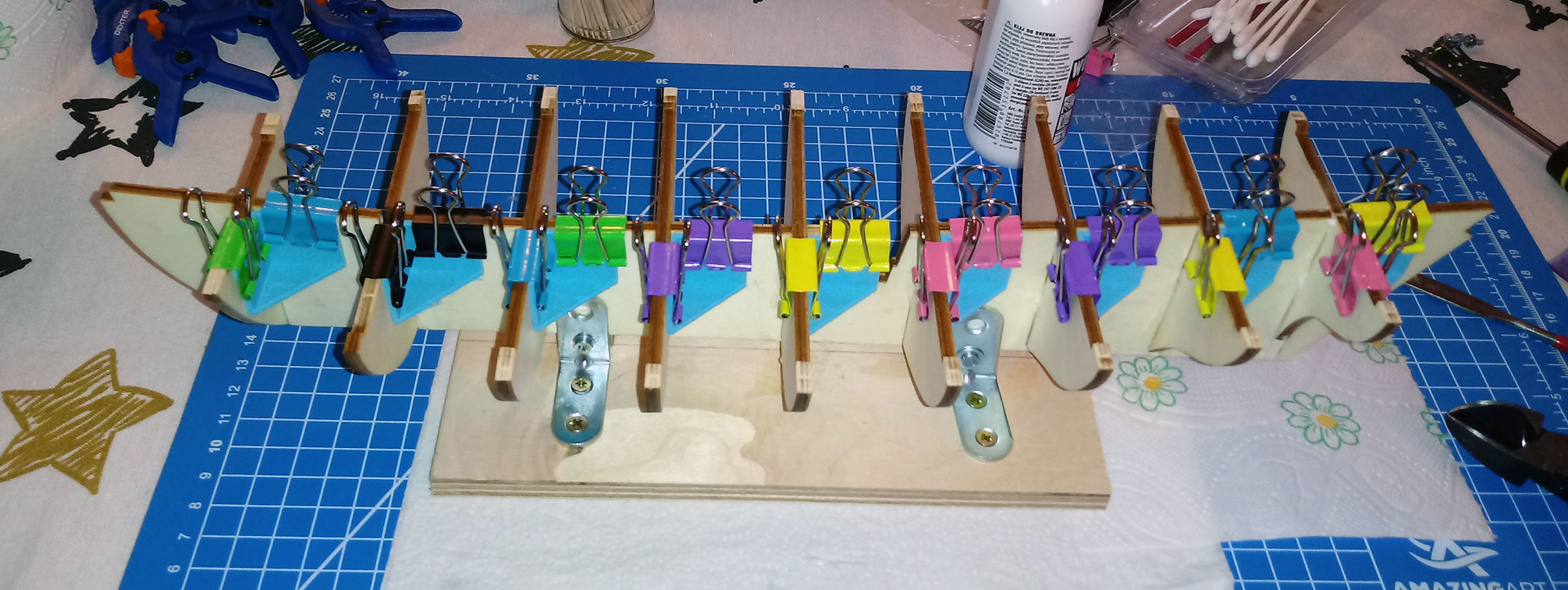 Wydrukowałem pomoc w postaci kątowników utrzymujących wręgi pod kątem 90 stopni.