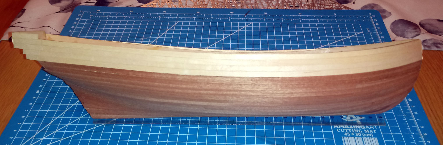 Tutaj kadłub po poszyciu i "nocnym doschnięciu". Listewki na dziobie i rufie jeszcze nie docięte i nie przyszlifowane.