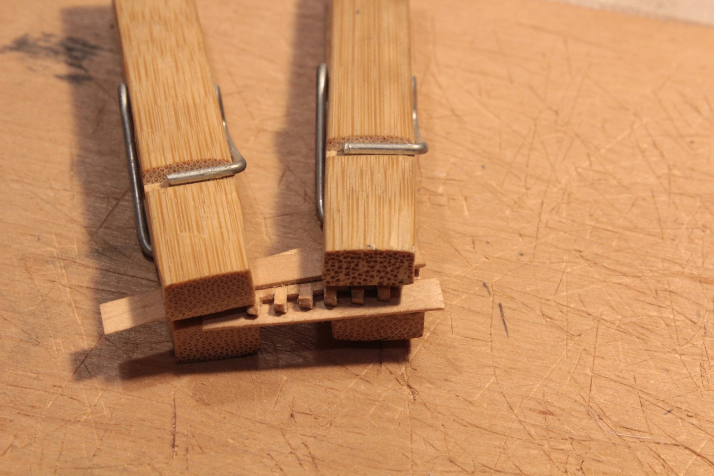 Profil wygięcia desek nadburcia kształtowałem na rozgrzanej lutownicy kolbowej, tej najtańszej o mocy 25 W (pokazywałem już to w relacji budowy RW). Kłopotem było to, że deski na tym etapie budowy trzymają się na styk.