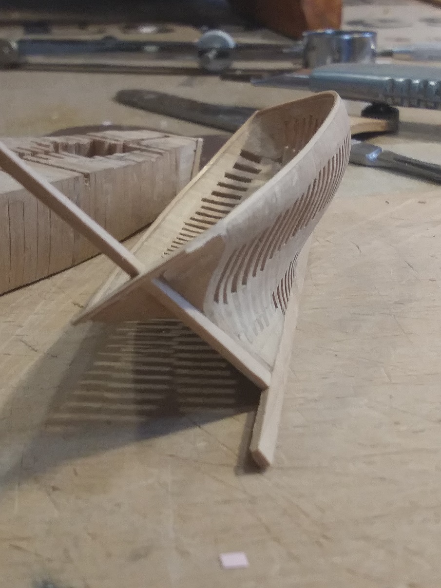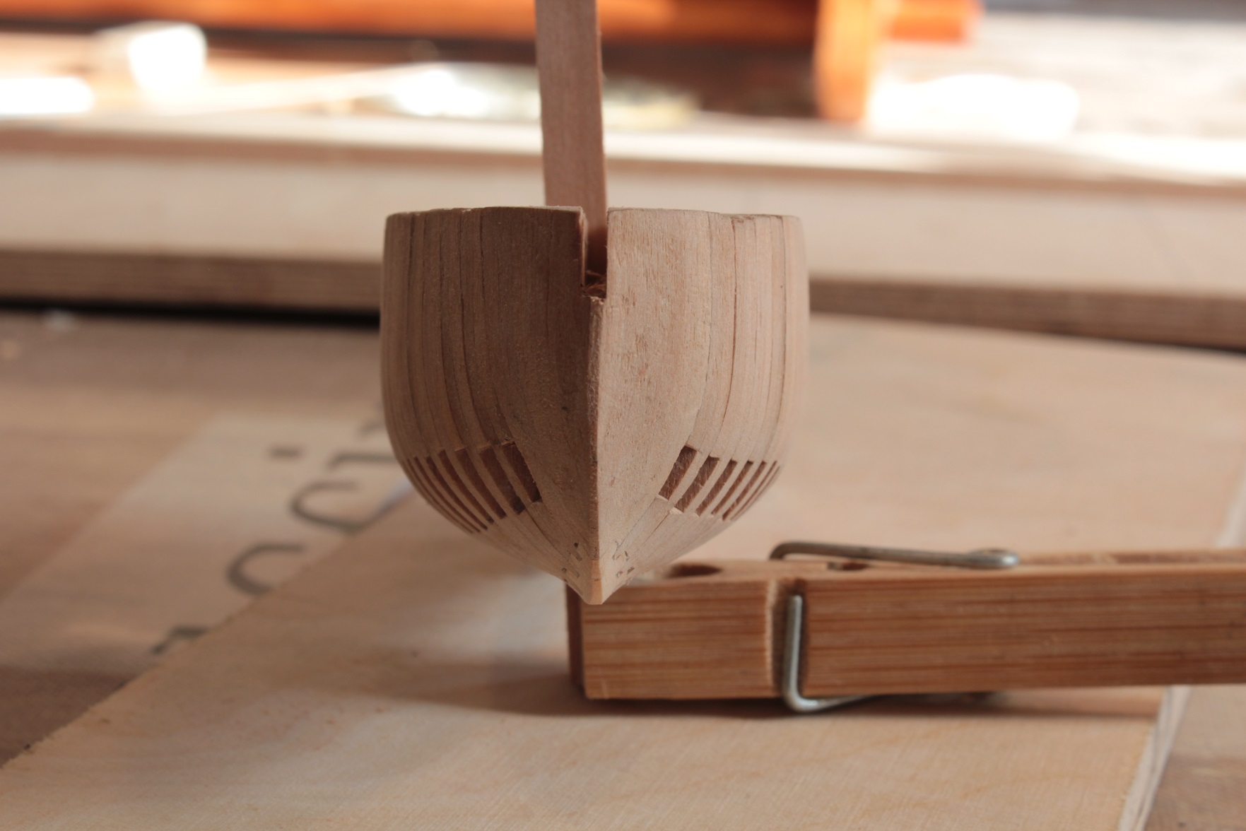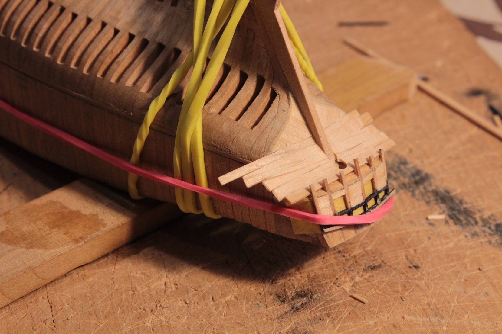 Dziś była stewa dziobowa i rufa. Musiałem wymyślić sposób wykonania i mocowania nadburcia rufowego. Udało się. Nadburcie trzyma się sztywno.