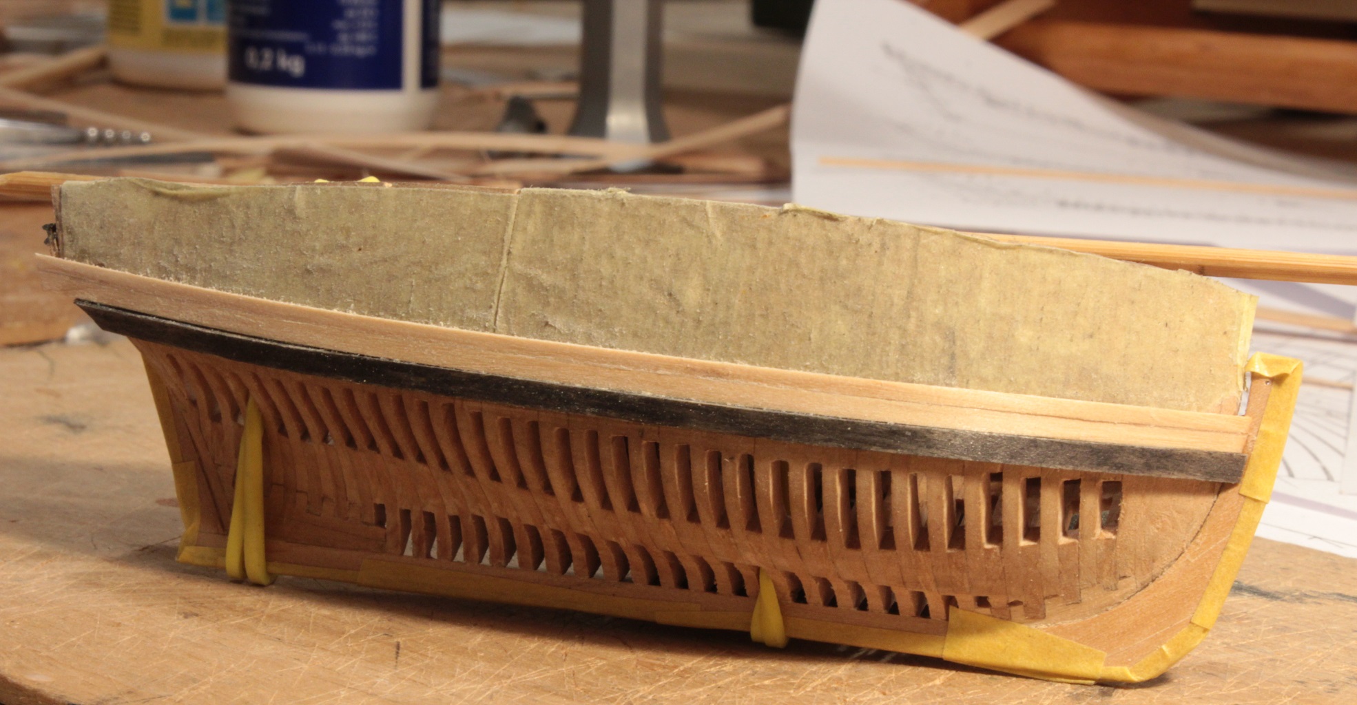 Górną część kadłuba podzieliłem na dwie części (traktuję jak kopyto) i obkleiłem taśma malarską, w taki sposób aby od strony kleju było do wierzchu. Założyłem, że klejąca warstwa będzie ułatwieniem wykonania nadburcia. Pomysł się sprawdził.