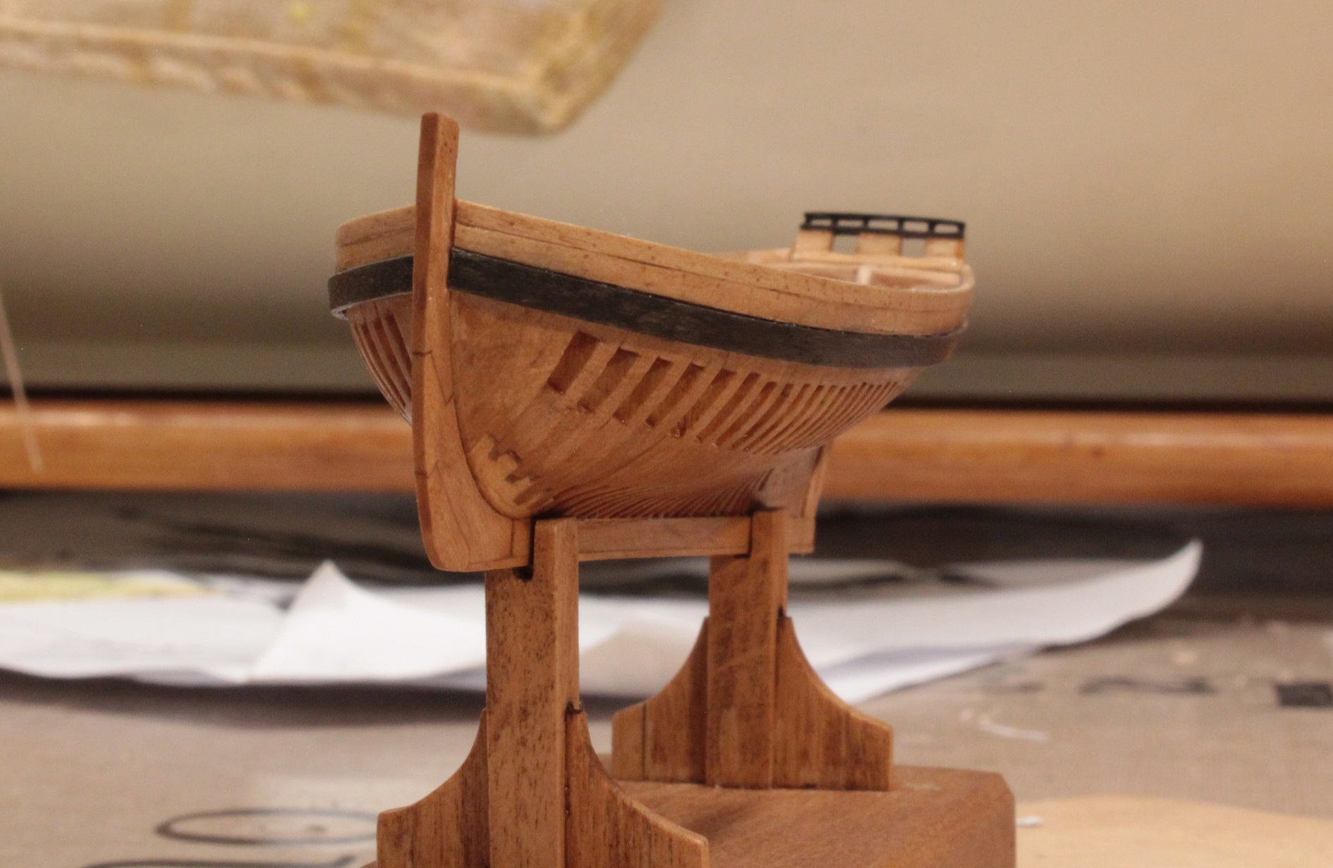 Gryzło mnie sumienie. Musiałem wzmocnić nadburcia z obawy, że jak kadłub poleży, to dojdą naprężenia wynikające z wilgotności powietrza i delikatna spoina na styku dech puści. Wzmocnienie zrobiłem z cienkich olchowych listewek. Zszedłem do 0,2 mm