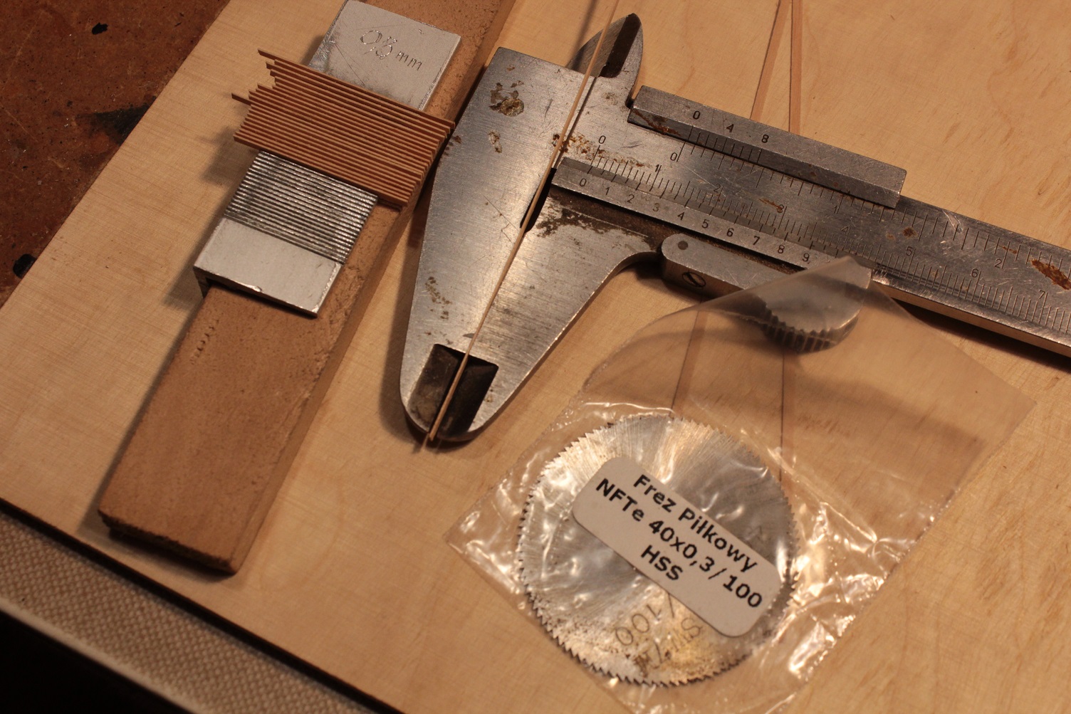 Początkowo chciałem naciąć wszystkie wpusty pod listwy wzdłużne gretingu. Ale przy tych rozmiarach listewek (ich grubość jest ciut mniejsza niż 0,3 mm, tak aby niezbyt luźno w grzebień wchodziły) zęby nacięć były czasem wyrywane. Wymyśliłem żeby po każdym wycięciu wpustów wklejać listwę wzdłużną.