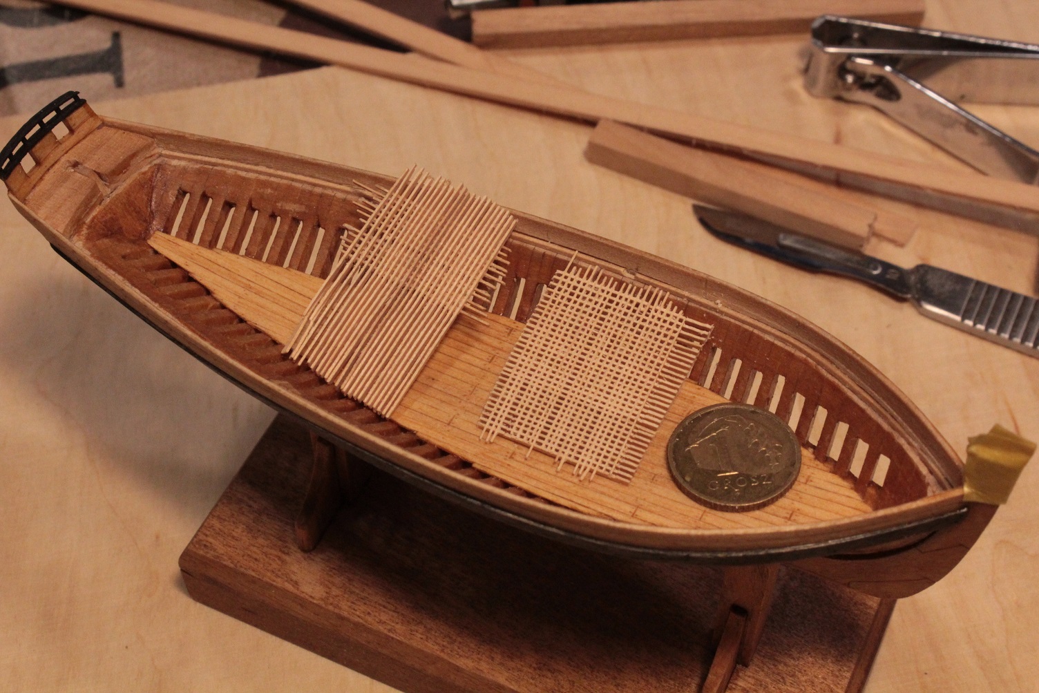 Przed wygładzeniem dech pokładu, naniosłem skalpelem linie podziałowe układu desek. Gwoździe nakłułem bardzo cienko zaostrzonym w szpic rylcem.