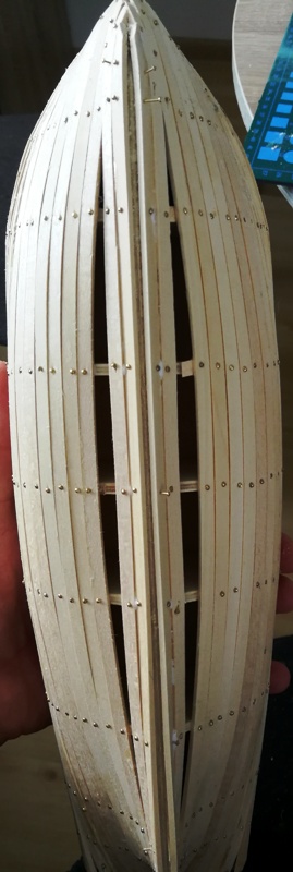 Mi się wydaje, że będę poszywac kadłub od niższego pokładu "działowego" , tam gdzie bukszpryt/ Dziób zaczyna się wydłużać , ma to sens? .