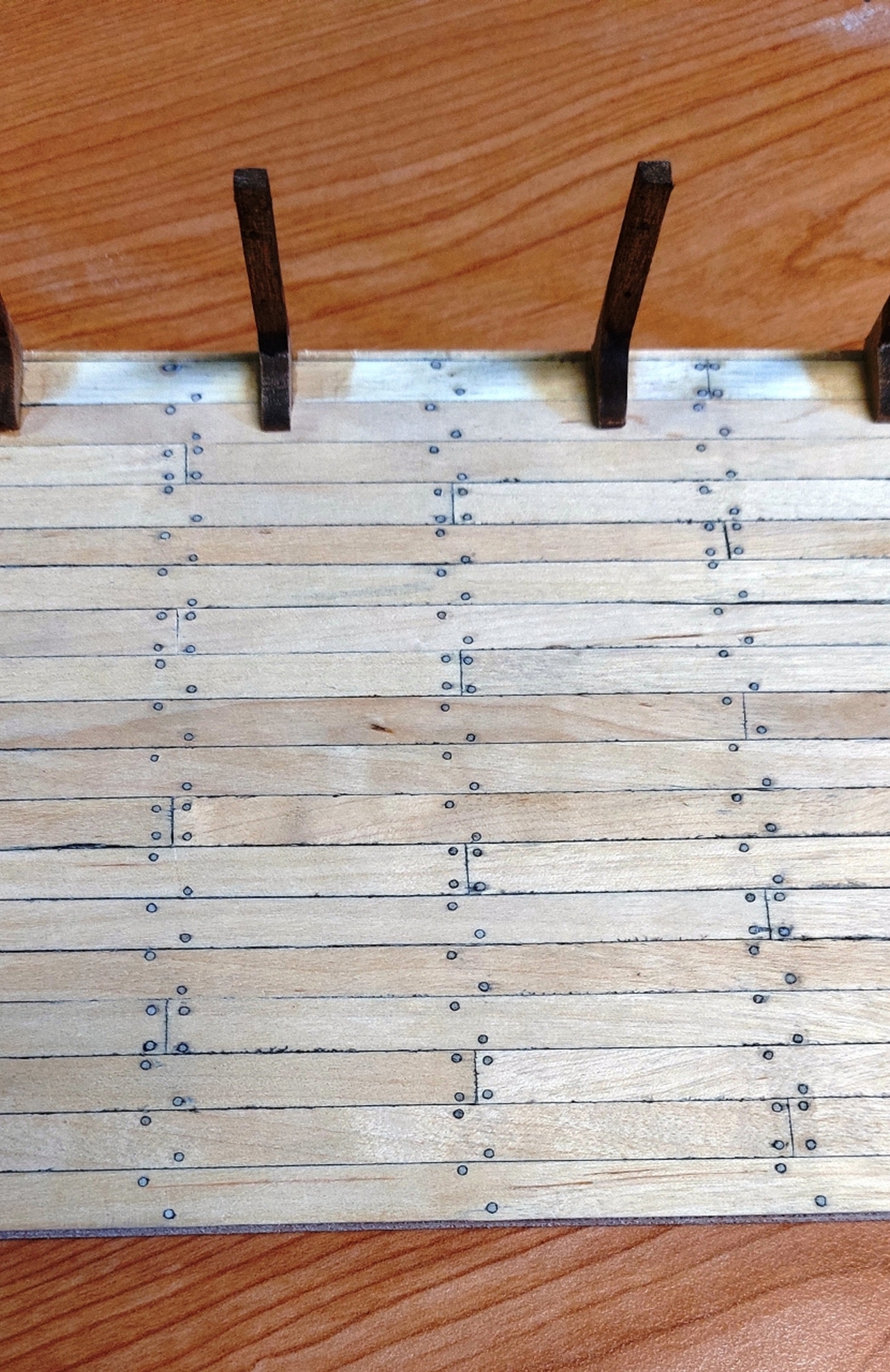 Pokład Nie byłem zachwycony z efektów, więc rozwiercilem wszystko i postanowiłem wbić normalne kolki bez malowania markerem dookoła. Burtą ciąg dalszy Laweta Bloczki Mocowanie lawety Efekt końcowy