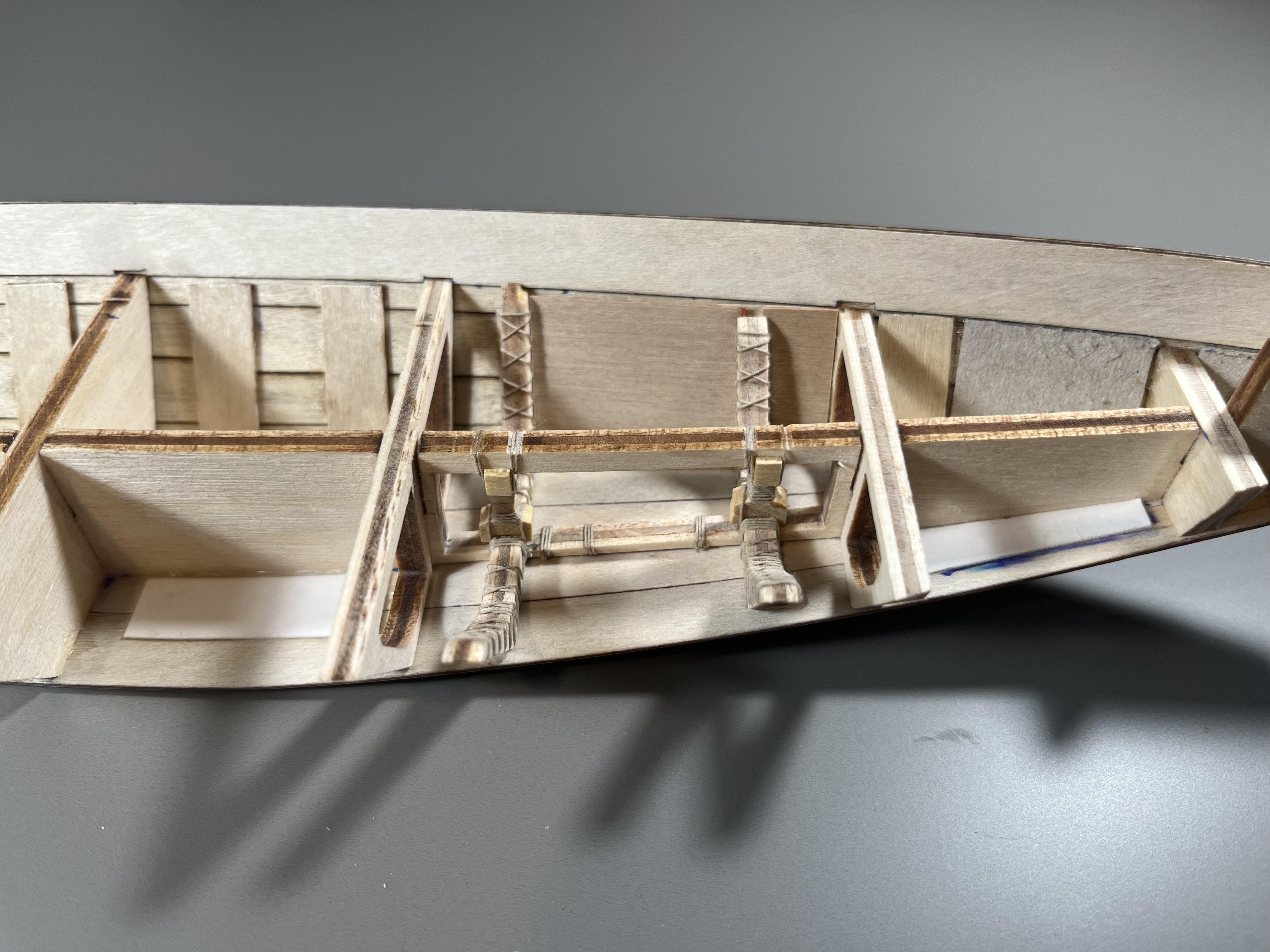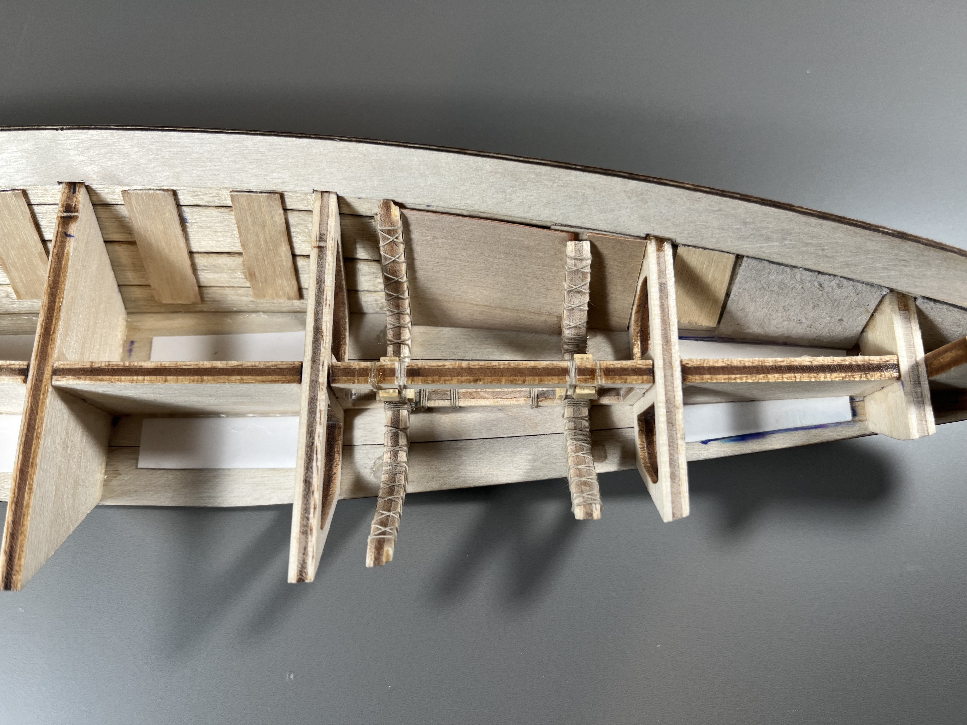 Ogólnie buduje się jednak całkiem przyjemnie choć moje doświadczenie z innych rodzajów modelarstwa procentuje bo gdyby robić literalnie wg instrukcji to troche proszenie sie o problemy. Na zdjęciach widoczna jest sekcja która ma pozostać otwarta do oglądania (nie przykryta pokładem), ma symulować starodawno-egipskie metody lączenia elementów za pomocą sznura - tutaj dbałem o estetykę, pozostała będzie przykryta pokładem i jak widać eksperymentowałem nieco z podklejkami: sklejka i tektura na różne sposoby.
