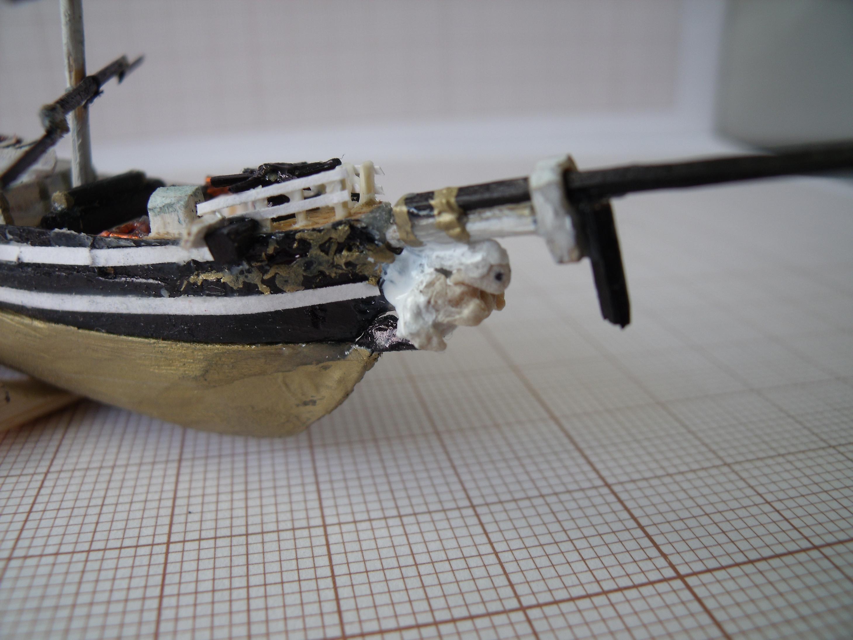 Umieściłem też galion pod bukszprytem. Może jest trochę za duży w stosunku do reszty kadłuba, ale nie mam już dwudziestu lat i ręce odmawiają współdziałania. Trudno taki już zostanie.