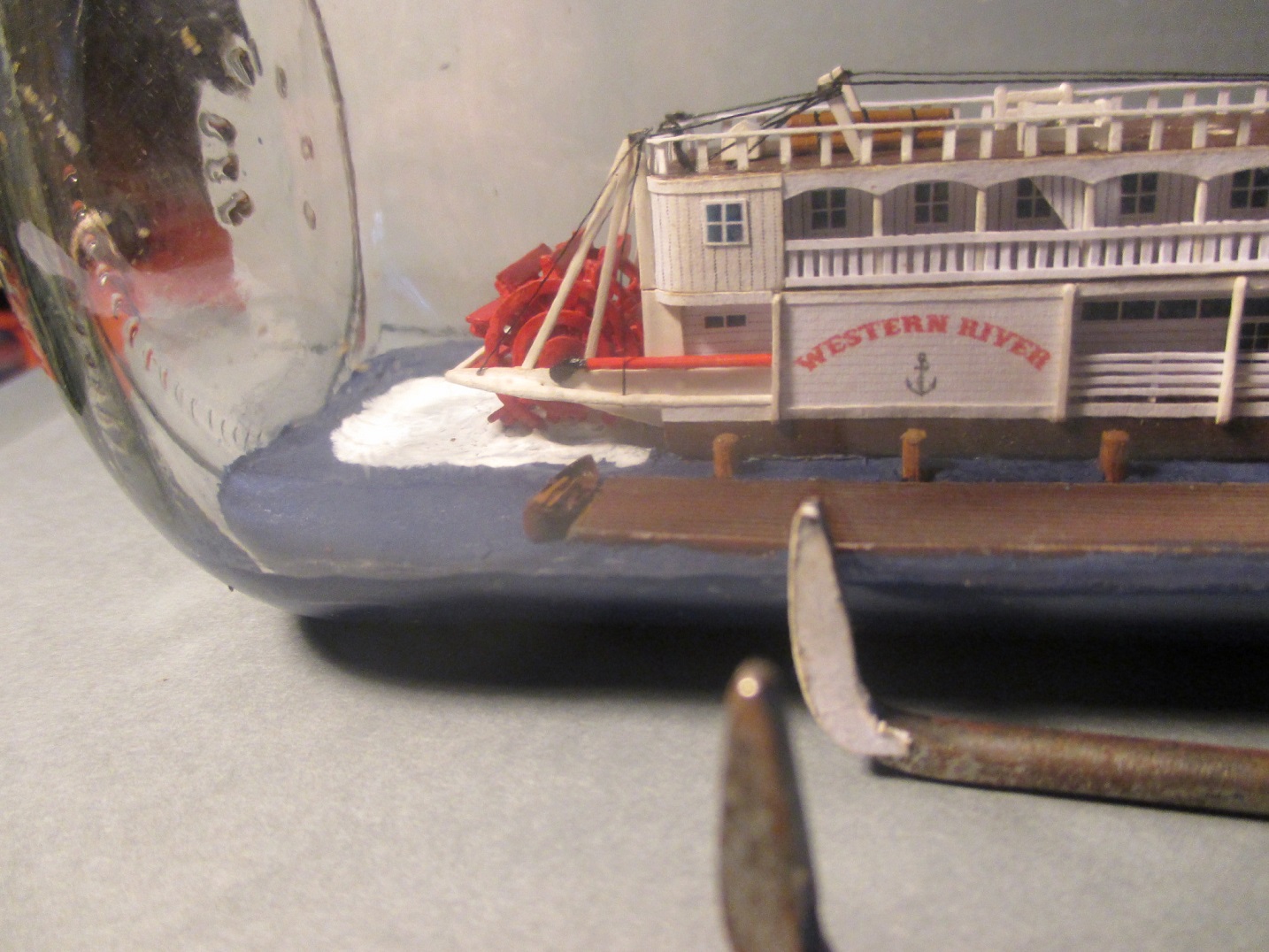 Zamontowałem dwie ostatnie kondygnacje. Tak mi się spieszyło,żeby je zobaczyć już w butelce, że zapomniałem najpierw wsadzić tylni maszt i cztery kominki. I teraz będę się gimnastykował,aby nie uszkodzić ozdób na sterówce podczas ich montażu.