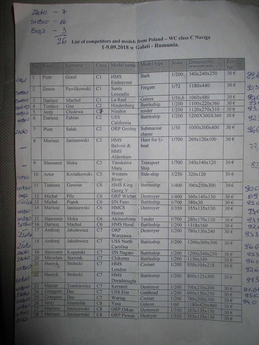 Wróciłem z Mistrzostw Świata Naviga klas -C Galati w Rumunii.Polscy modelarze wystawili 28 modeli.Zdobyliśmy 26 medali. 7 złotych, 16 srebrnych i 3 brązowe. Wszystkim serdecznie gratuluję.Atmosfera w grupie była wspaniała.Wszyscy staraliśmy się nawzajem wspierać. Ja osobiście przed oceną zostałem na szczęście dwa razy kopnięty w tyłek. Pomogło, bo zdobyłem srebrny medal, z czego jestem bardzo zadowolony.