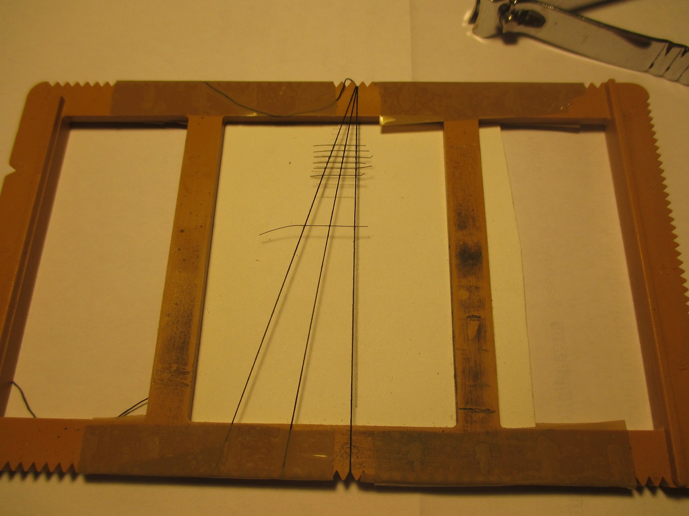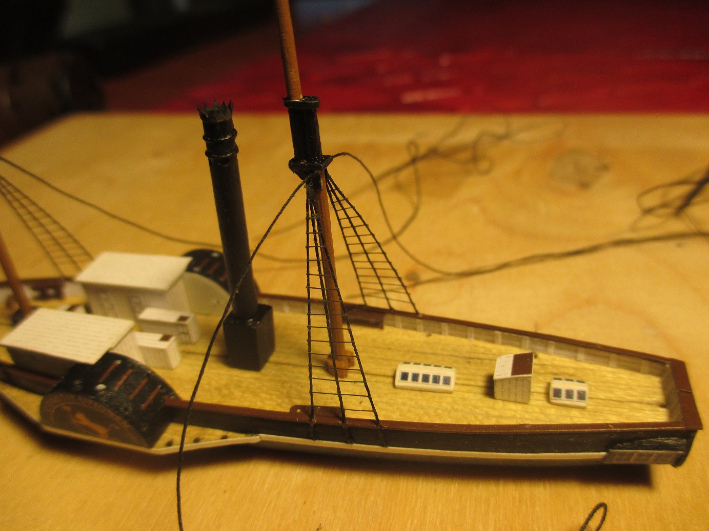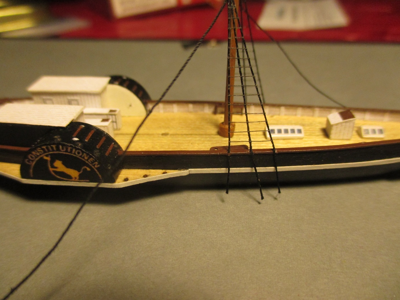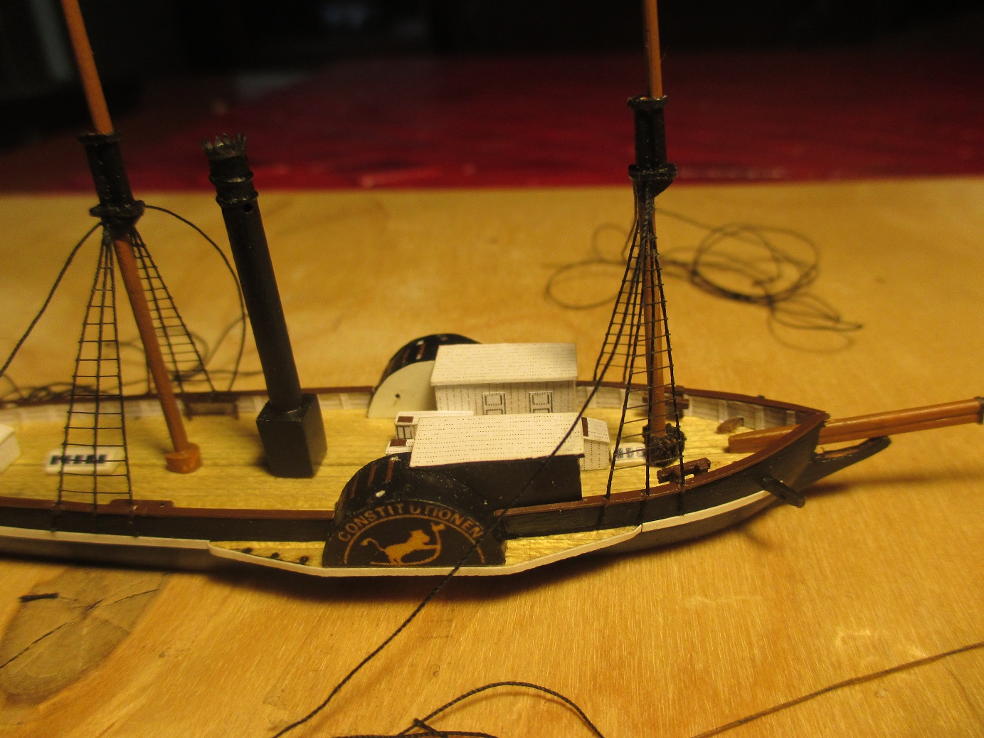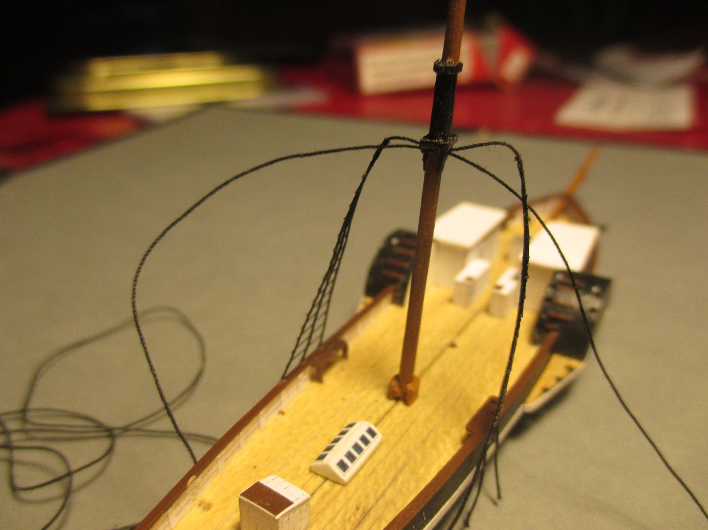 Wanty zamontowane. Maszty będę mocował dopiero po osadzeniu kadłuba w butelce i naciągał wanty przez otwory wywiercone w masztach. Przestudiowałem olinowanie i doszedłem do wniosku, że sporo będzie mi wychodzić nitek z butelki służących do naciągania lin. Mogę mieć w środku niezłą plątaninę. Tego się trochę obawiam.