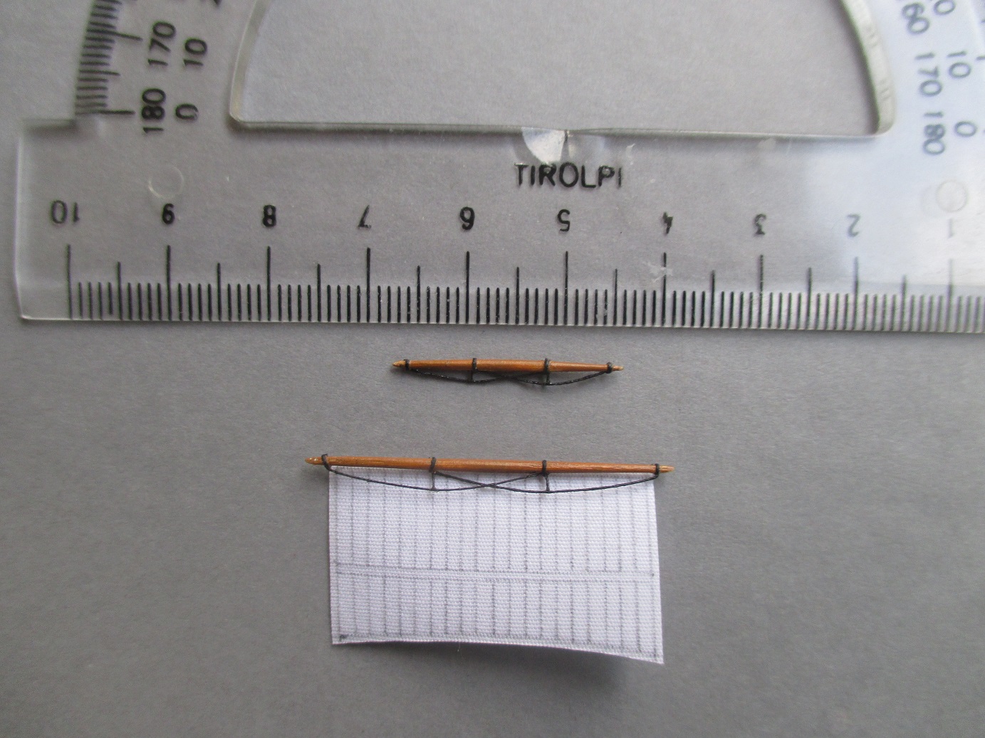 Żagle uszyte. Teraz czas je zamontować na drzewcach. I tu mam mały problem. Nie wiem w jaki sposób żagle są mocowane do rei i gafla. Wzdłuż rei biegnie jakiś pręt /zdjęcie poniżej/ do którego domyślam się że jest mocowany żagiel.Tylko czy za pomocą jakiś zaczepów czy liny. Czy do gafla żagiel jest mocowany liną na okrętkę czy jest jakiś inny sposób.