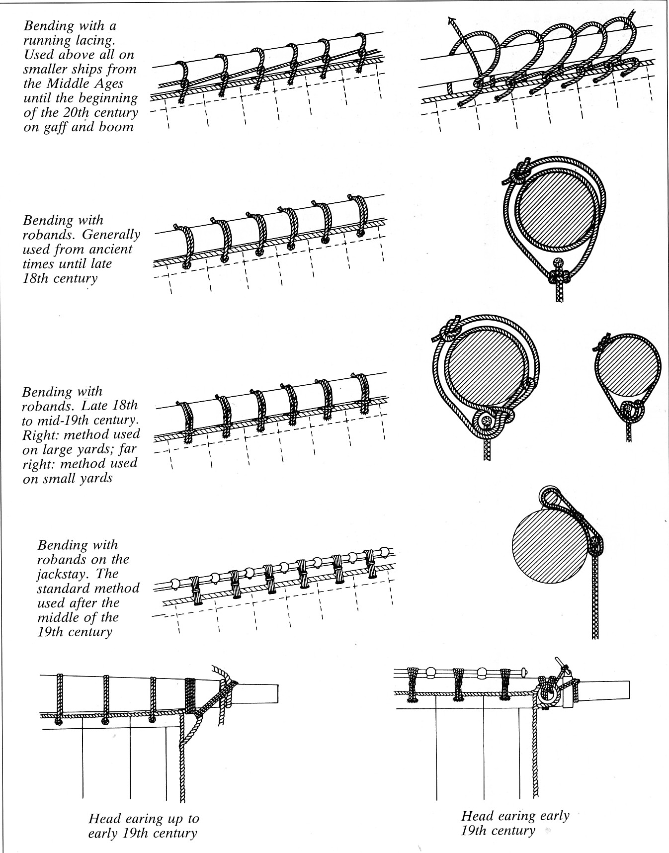 Zu Mondfeld w swej ksiazeczce pokazuje, ze ow "metalowy pret" - w nazewnictwie anglosaskim - "Jackstay" (niem. Jackstag) sluzyl wtedy wlasnie do zamocowywania gornej krawedzi zagla czworokatnego do rei, najpierw byl w postaci liny biegnacej wzdluz gornej powierzchni rei, potem juz jako metalowy pret. Przedtem zamocowywano zagiel bezposrednio do rei odpowiednimi do epoki oplotami z liny. W Twym przypadku sugerowalbym sie jak to jest pokazane na skanie - sytuacja czwarta idac od gory ku dolowi.
