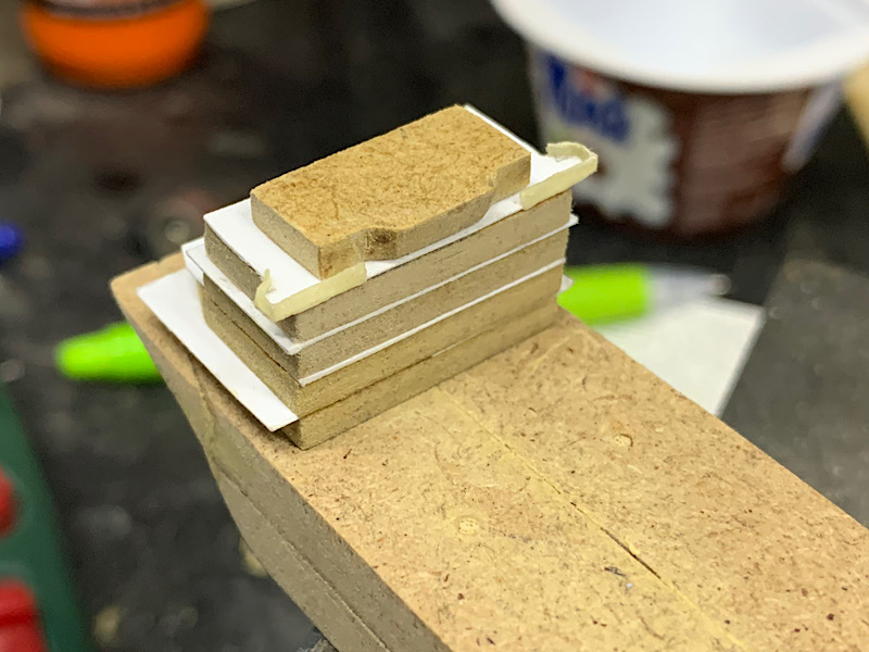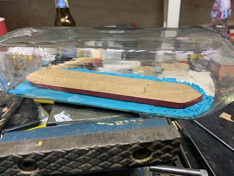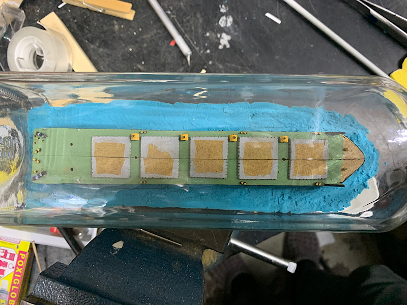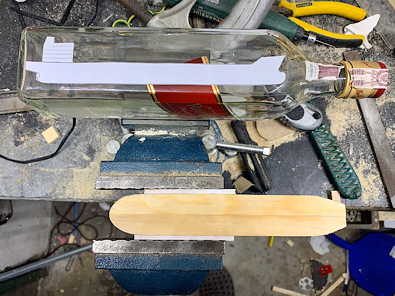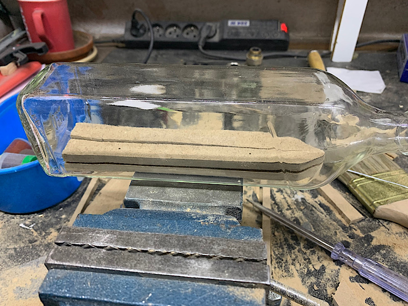 Kadłub nr2 wykonuje z płyty HDF 6mm grubości, wybór materiału był trochę przypadkowy- akurat walała się po warsztacie i jestem nią zachwycony, jest genialnie prosta w obróbce: łatwa w przycięciu, szlifowaniu itp. Drugi kadłub wykonany jest w 4 częściach, poniżej foto z przymiarki już wewnątrz butli. Nie robiłem jeszcze tak dużego modelu w butelce ( kadłub 190mm długości) i chciałem zobaczyć czy uda mi się w ogóle połączyć elementy w środku.