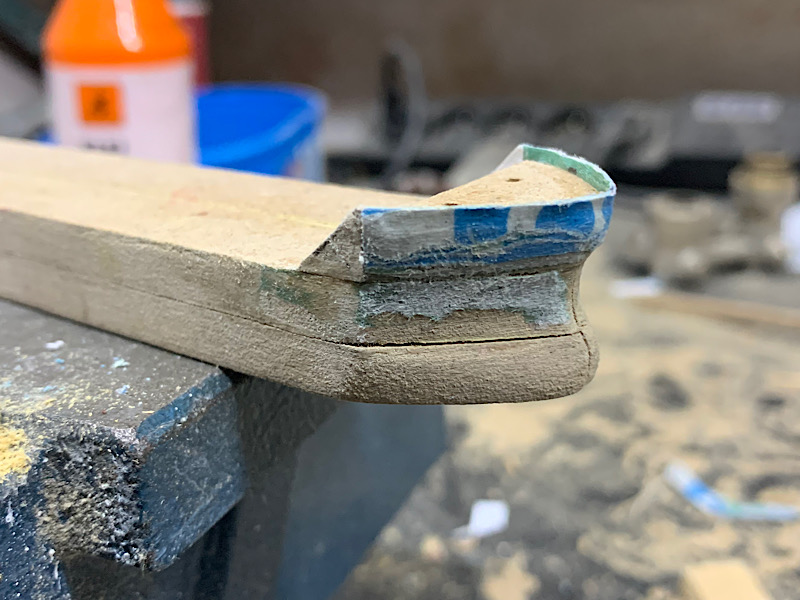 Przystąpiłem do zabawy: kadłub nr 1 drewno sosnowe, zepsułem w nim zarówno kaształt gruszki dziobowej jak i rufę, dodatkowo nidoszacowałem szerokość szyjki i kadłub wymagał by podziału na 4 elementy co przy drewnie sosnowym, ograniczonych narzędziach i słabej wiedzy jak z drewnem w ogóle pracować poskutkowało zmianą koncepcji, przy okazji można podejrzeć jak model będzie wypełniał butelkę ( zależało mi aby wypełnić wnętrze najbardziej jak się da)