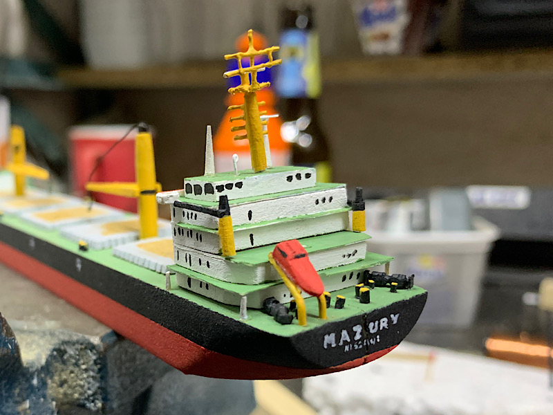 Szlif oczywiście zrobiłem ale wydaje mi się że zbyt mały, niestety jestem już na etapie w którym tego nie poprawię, poniżej foto na którym bazowałem i wydawało mi się ta cześć jest niemal pionowa. Po ostatnim wpisie zacząłem kopać i znalazłem zupełnie inne ujęcie z którego wynika ze jednak nie jest. Co do rufy to schodzi bardzo krótko i bardzo gwałtownie mniej więcej od połowy nadbudówki.