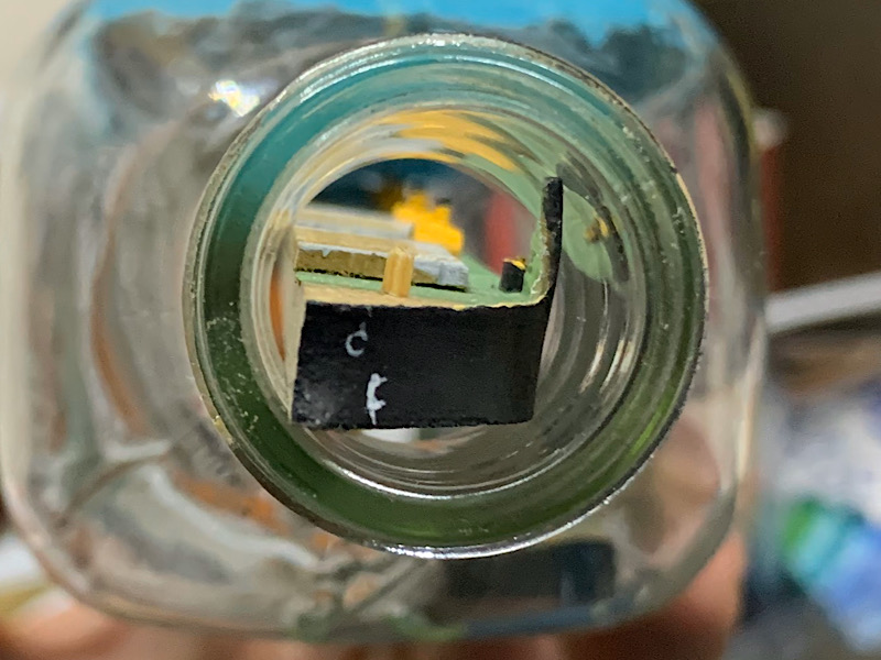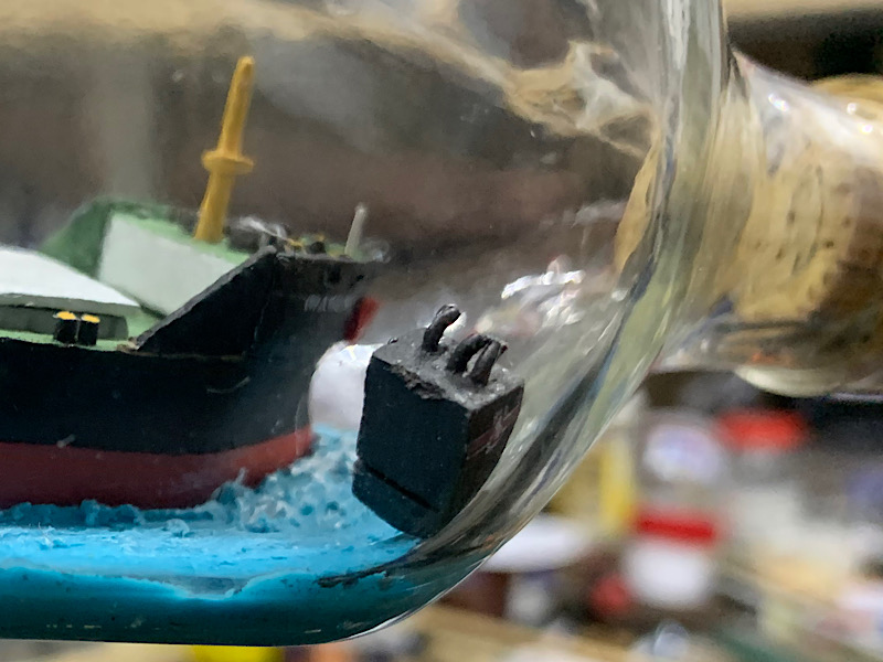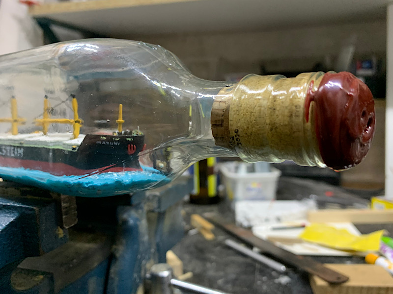 po zakorkowaniu odpadł komin, tutaj jest mój duży błąd, składanie na sucho było banalnie proste, jednak z perspektywy prawie 20cm odległości komina od wejścia butelki już takie nie było, za słabo docisnąłem komin i odpadł