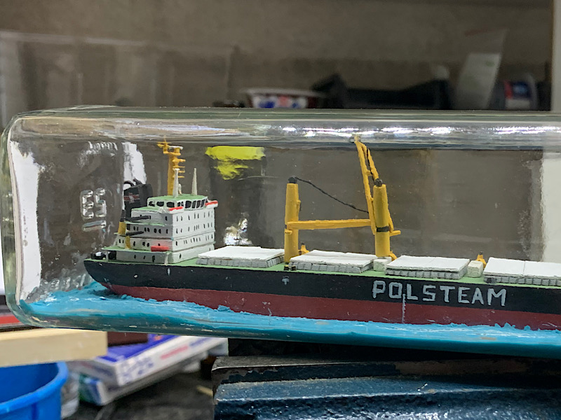 Raz na jakiś czas przychodzi mi do głowy pomysł żeby pobawić się w modelarstwo i poświecić trochę czasu by upchnąć coś w szkło. Wiele lat temu widziałem model masowca w butelce co wielce mnie zaskoczyło i zrodziło chęć by coś takiego wykonać (dotychczas rafandynki kojarzyły mi się tylko z żaglowcami). Szkło to butelka po whiskey 0,75l o średnicy otworu ok 20mm. Po poszukiwaniach wybrałem polskiego masowca MS Mazury, skala 1:1000