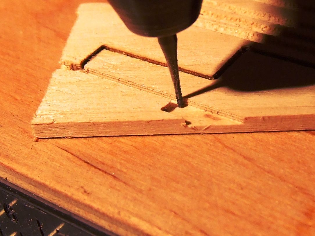 Na fotce sklejka 1 mm przyklejona taśmą i frezowana frezem 1,2 mm.