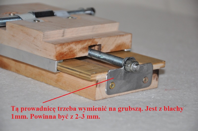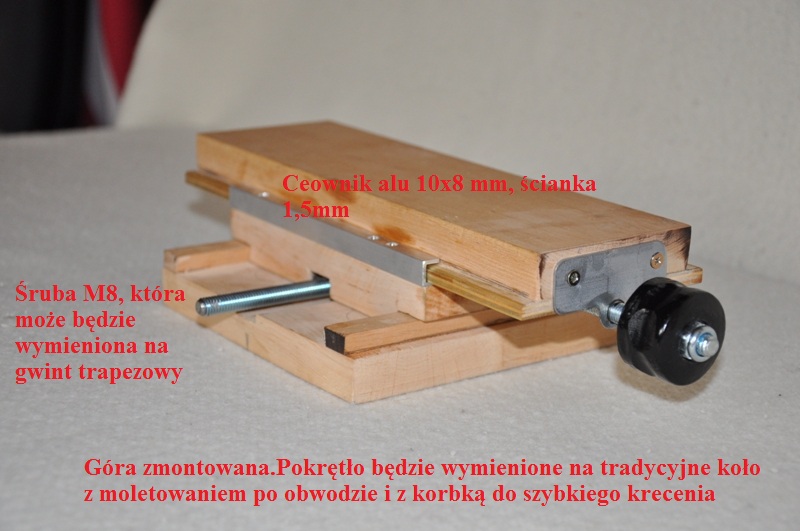 Wykonany jest z dechy olchowej (taką akurat miałem pod ręką). Ceowniczek alu też był w moich szpejach. Potraktowałem to jako model prototypowy i jak sie sprawdzi to dopiero "odstrzelę" maszynkę. Z drugiej strony - przeważnie prowizorki działają latami. Ustrojstwo wykonane zostało wczoraj i jest w fazie wykończenia. Brakuje jeszcze tego i owego, ale muszę prace pozostawić do nowego weekendu. Żona by mnie wykwaterowała, gdybym włączył jazgoczącego Dremela. Myślę, że dla panów szerszy opis jest zbędny. Fotografie wystarczą. Ja będą pytania - chętnie odpowiem.