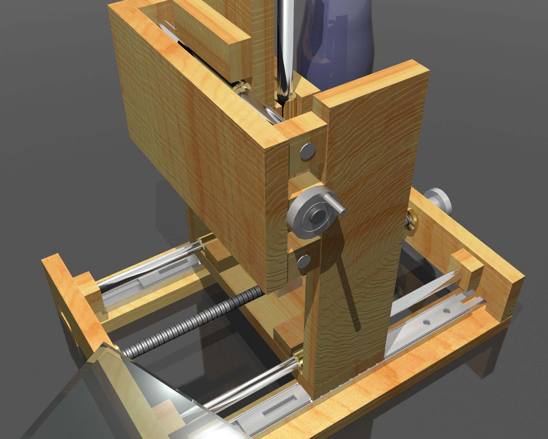 . Moja niestety będzie manualna (jeśli projekt się powiedzie). Całość ma działać na prowadnicach Ø10mm po 200mm dla osi z x i 300mm dla y z tulejkami z brązu 70mm, przy czym y zamierzam usztywnić szynami do szuflad, konstrukcja z płyt 15 i 20 mm. Jeżeli uda się to równolegle poskładać prowadnice to powinno działać. Projekt na razie wirtualny w dużym uproszczeniu, powstał w celu wymiarowania poszczególnych desek i teoretycznego rozmieszczenia części.