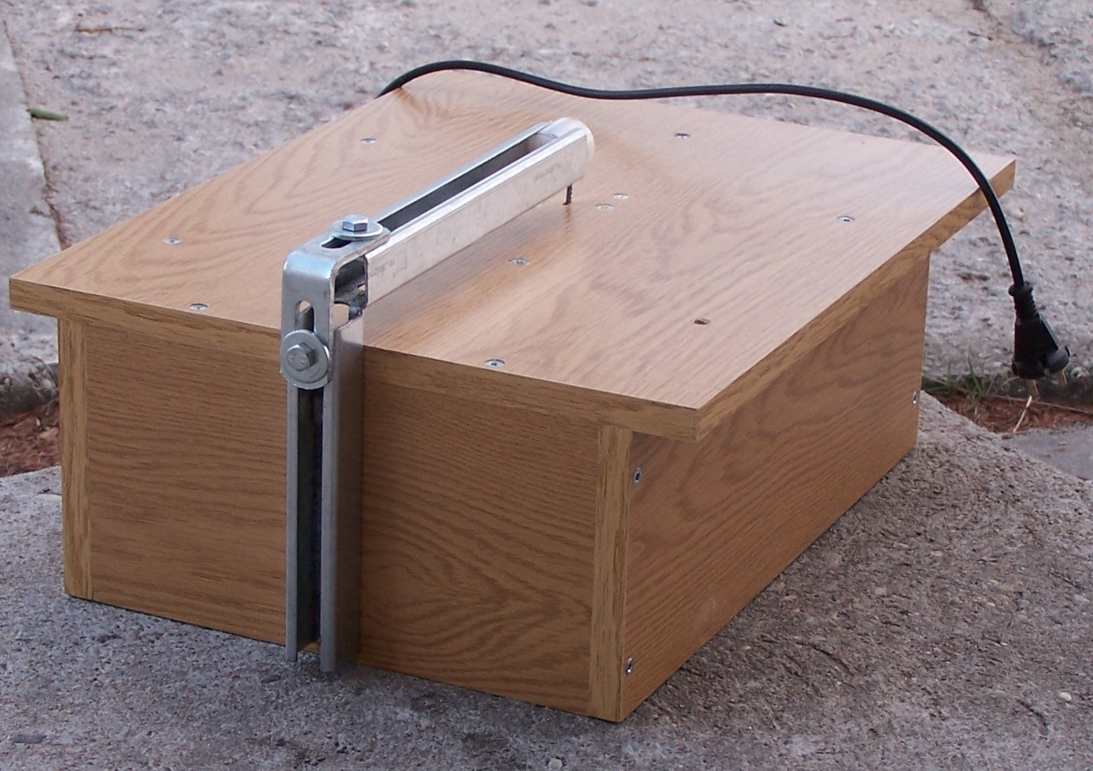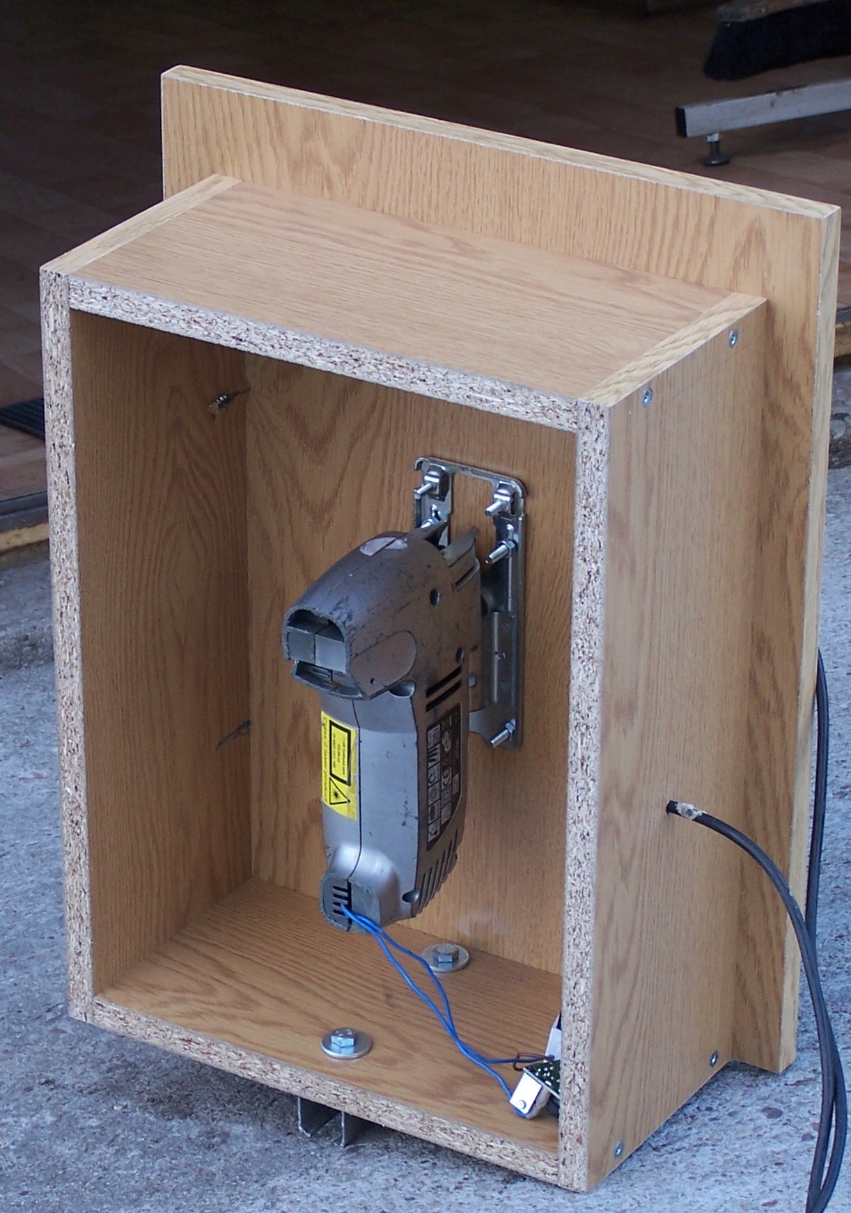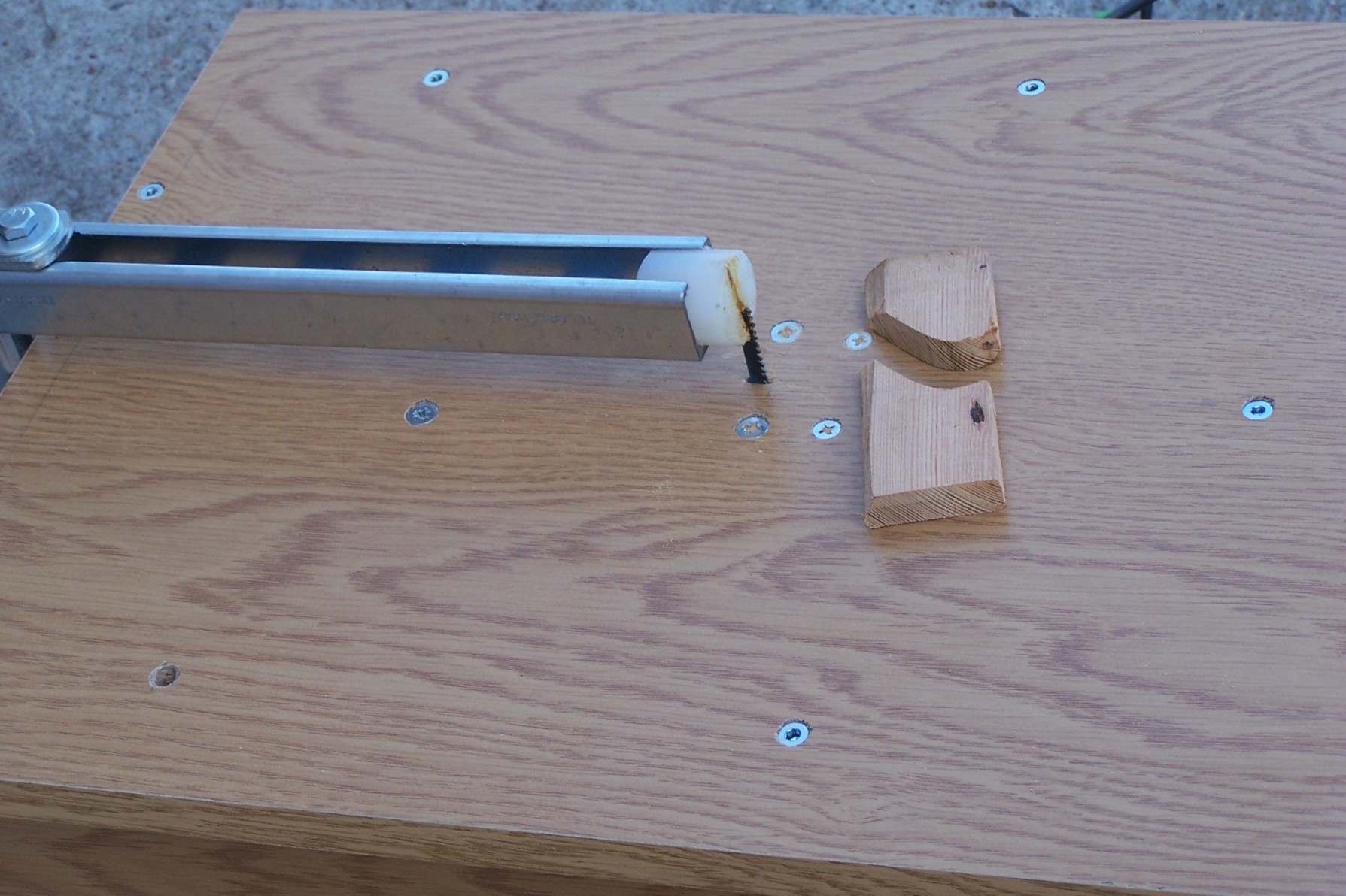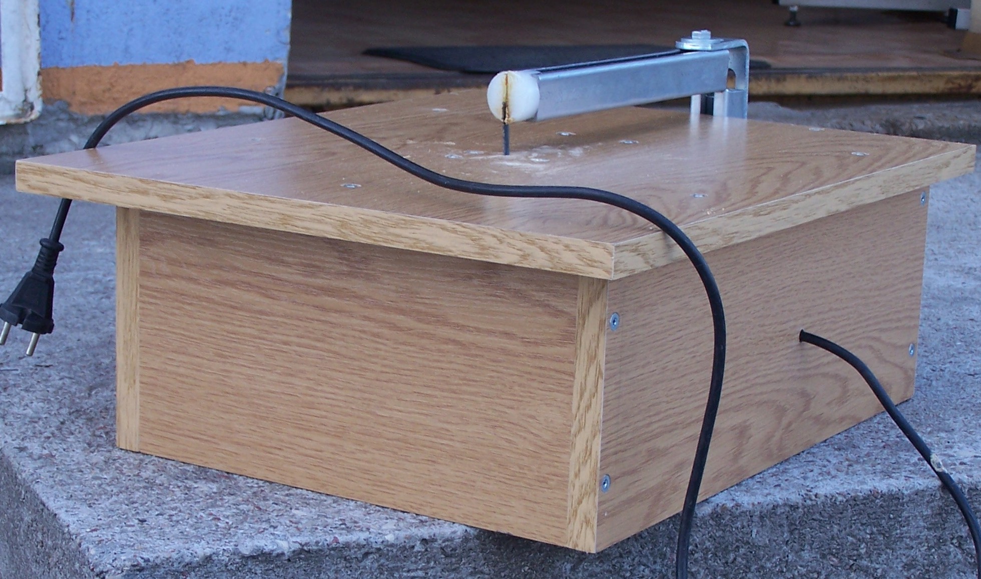 Wyrzynarka ma obcięty uchwyt żeby zmniejszyć wysokość skrzynki . bardzo ważne aby podtrzymka nożyka była stateczna ( gruba i mocna ) , wykonałem ją z podtrzymki rur wodociągowych z supermarketu . Natomiast główka z ternamitu , tworzywo podobne do teflonu i nylonu .