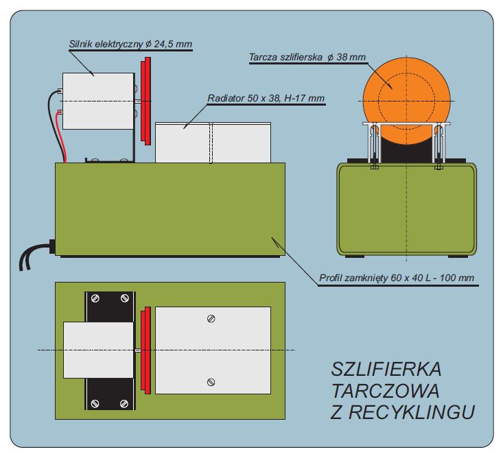 Kilka lat temu przeglądając swój "złom" (części RTV) doszedłem do wniosku, że mam wszystko co potrzeba do zrobienia szlifierki tarczowej. Za podstawę wykorzystałem profil zamknięty 60x40, L-100 mm (też z odzysku - od kolegi, który spawał jakąś konstrukcję i zostały mu kawałki matalu). Z obu stron został zaślepiony spienionym PCV, co by się kurz i brud nie zbierał wewnątrz. Za stolik posłużył kawałek radiatora 50x38, H-17 mm. Silnik z podstawą to też fragment z demobilu, ale nie wiem czy z radia czy magnetofonu lub magnetowidu. To samo z taczą fi 38 mm.