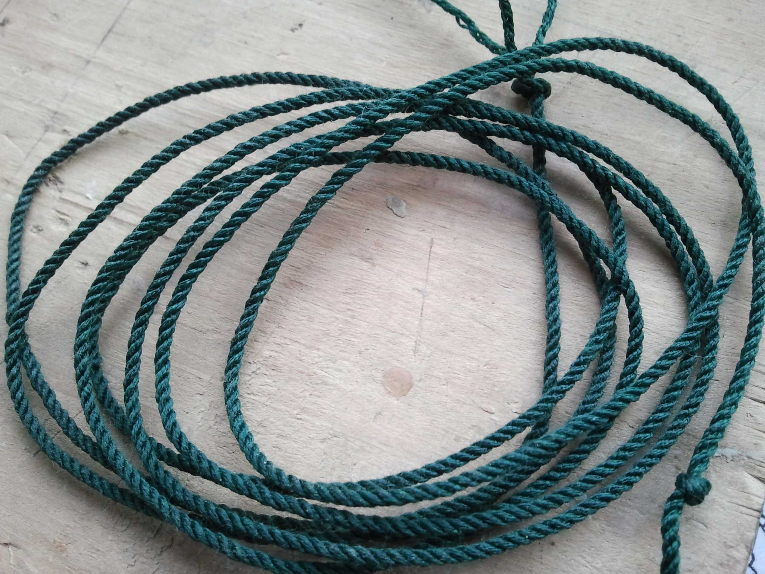 Ropewalk gotowy w 30%.Kręci się coraz lepiej,koła się docierają.Wziąłem zwykłe nici do szycia i ukręciłem z 12 nitek ok.1,5 m linkę.Na zdjęciu linka zaraz po zdjęciu z ropa,nie impregnowana.