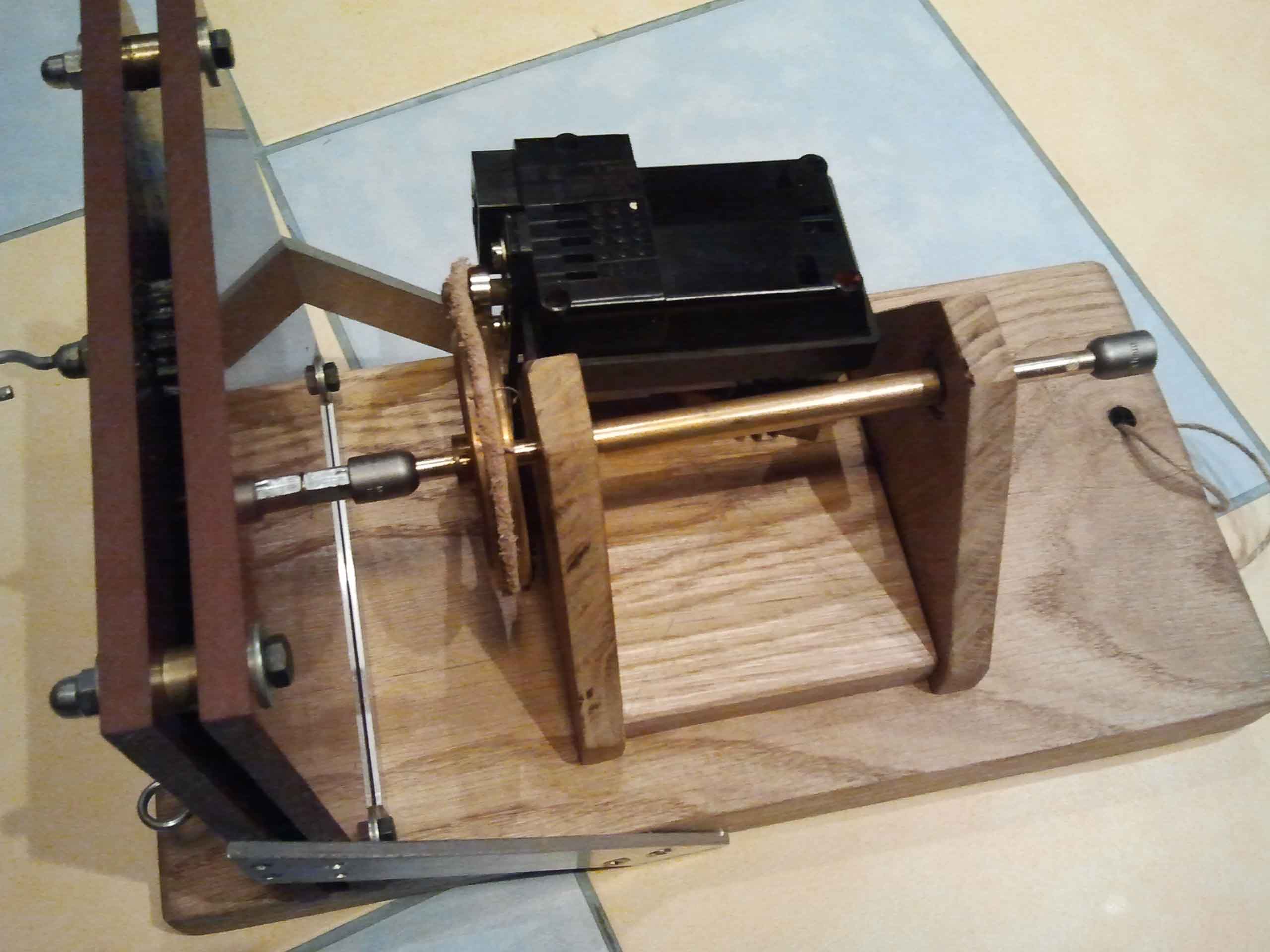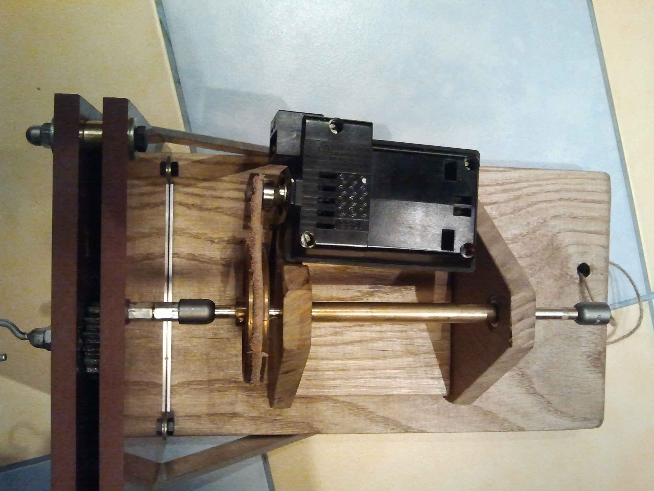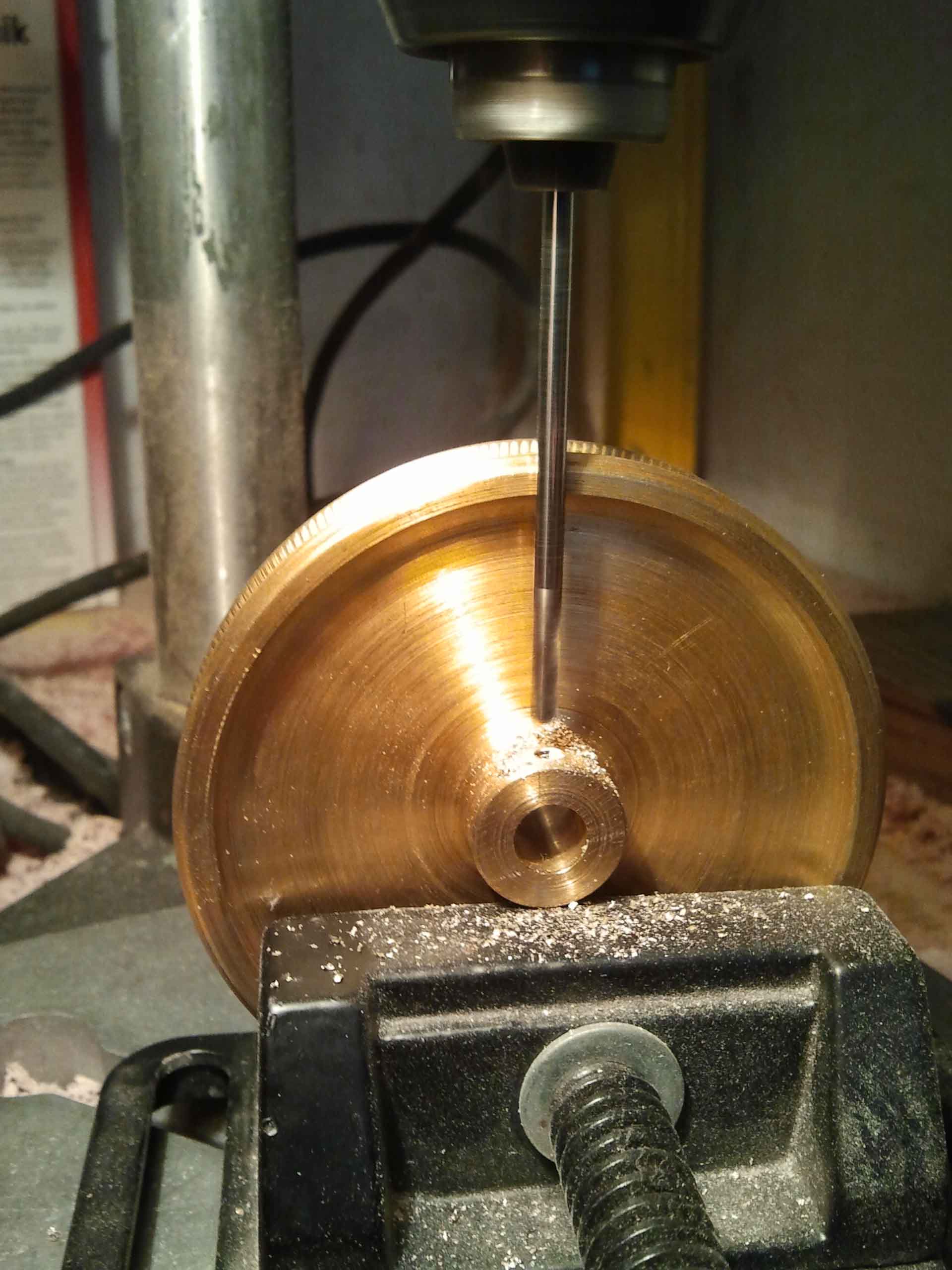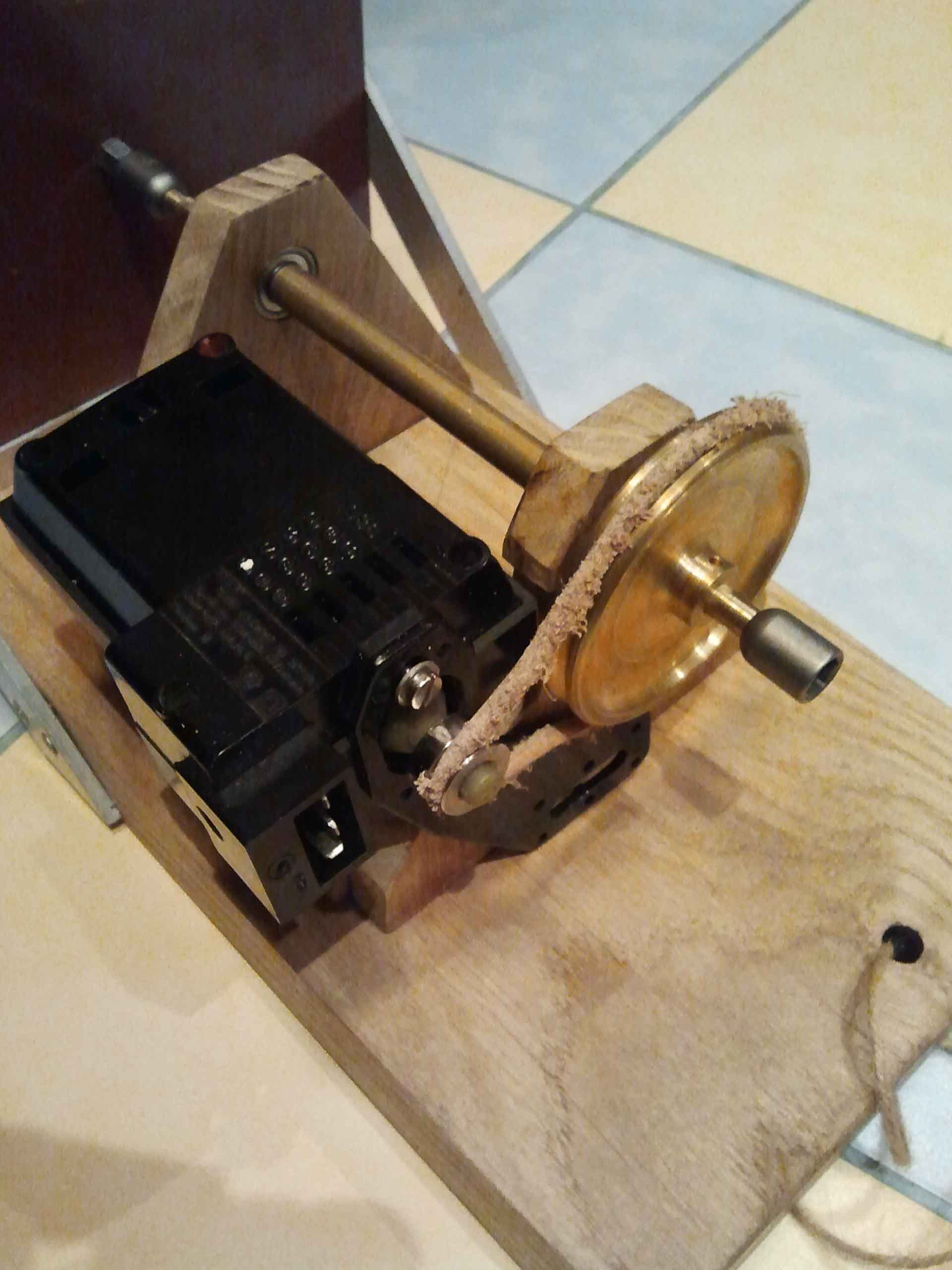Następne prace przy napędzie.Wywierciłem otwór w kole pasowym pod klin mocujący go z osią napędową.