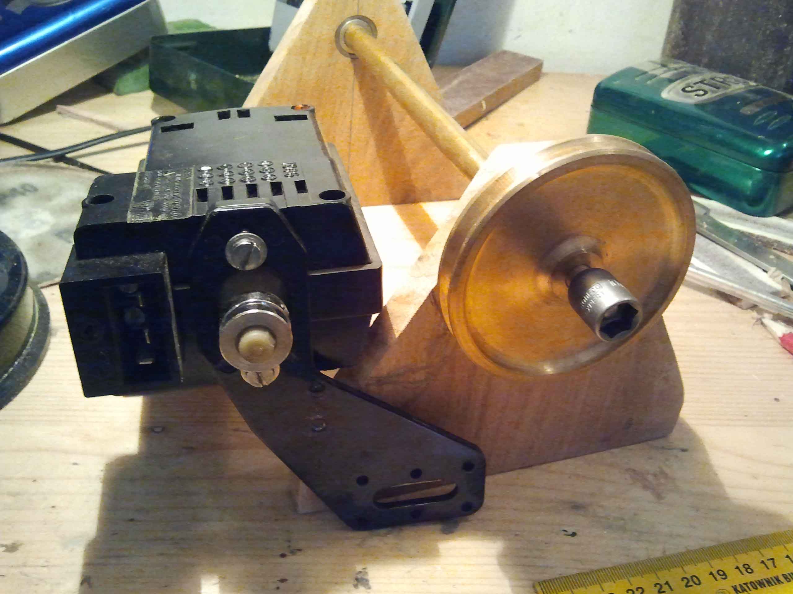 To jest silnik od maszyny do szycia z regulacją obrotów pedałem.Zamiast paska skórzanego proponowałbym Ci oring o grubości ~3,5mm. Nie wyciąga się i nie posiada bicia bo jest elastyczny .U mnie sprawuje się świetnie.R
