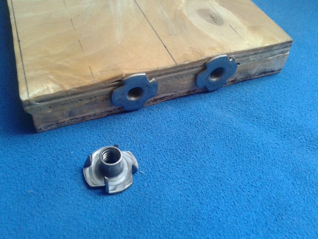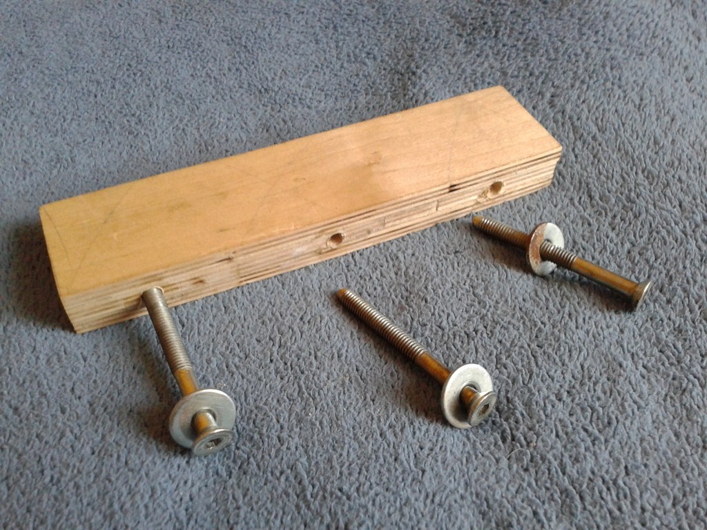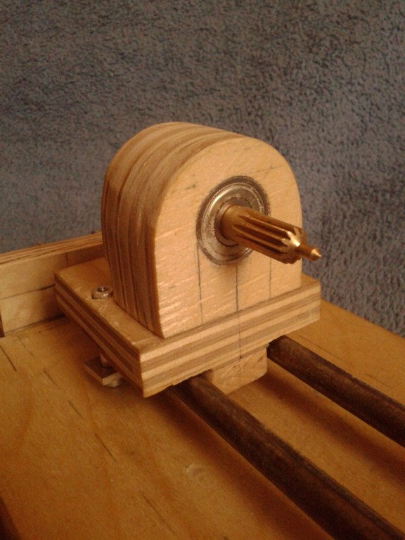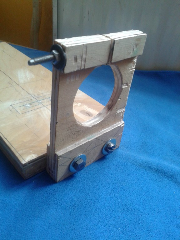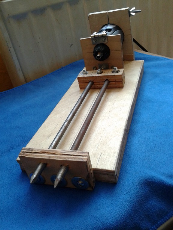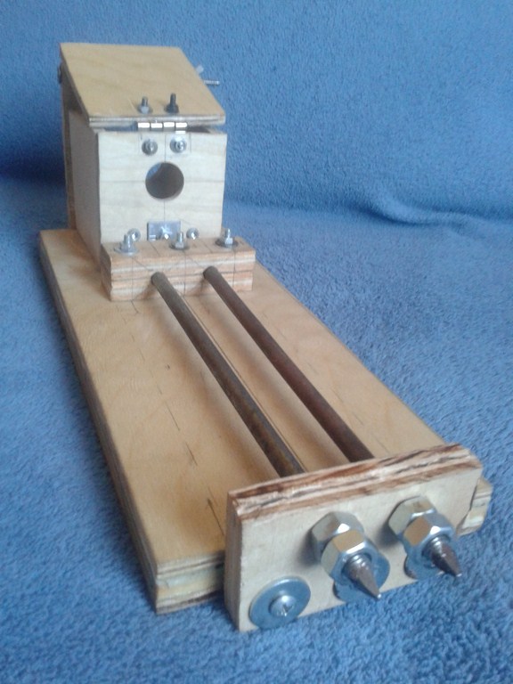 Jako prowadnice po których porusza się konik tokarki, użyłem dwa gwoździe budowlane o wymiarach 7mm x 225mm, przy czym zostały one nagwintowane standardową narzynką M8 u dołu na długości około 3 cm po to, aby po zamocowaniu ich w zaciskach ze sklejki jedna strona zaparła się o wspomniany zacisk "łepkiem" (obuchem? nie wiem jak to nazwać), a druga nakrętkami z podkładkami nakręconymi na wcześniej wykonany gwint. Wszystko trzyma się stabilnie i nie luzuje się.