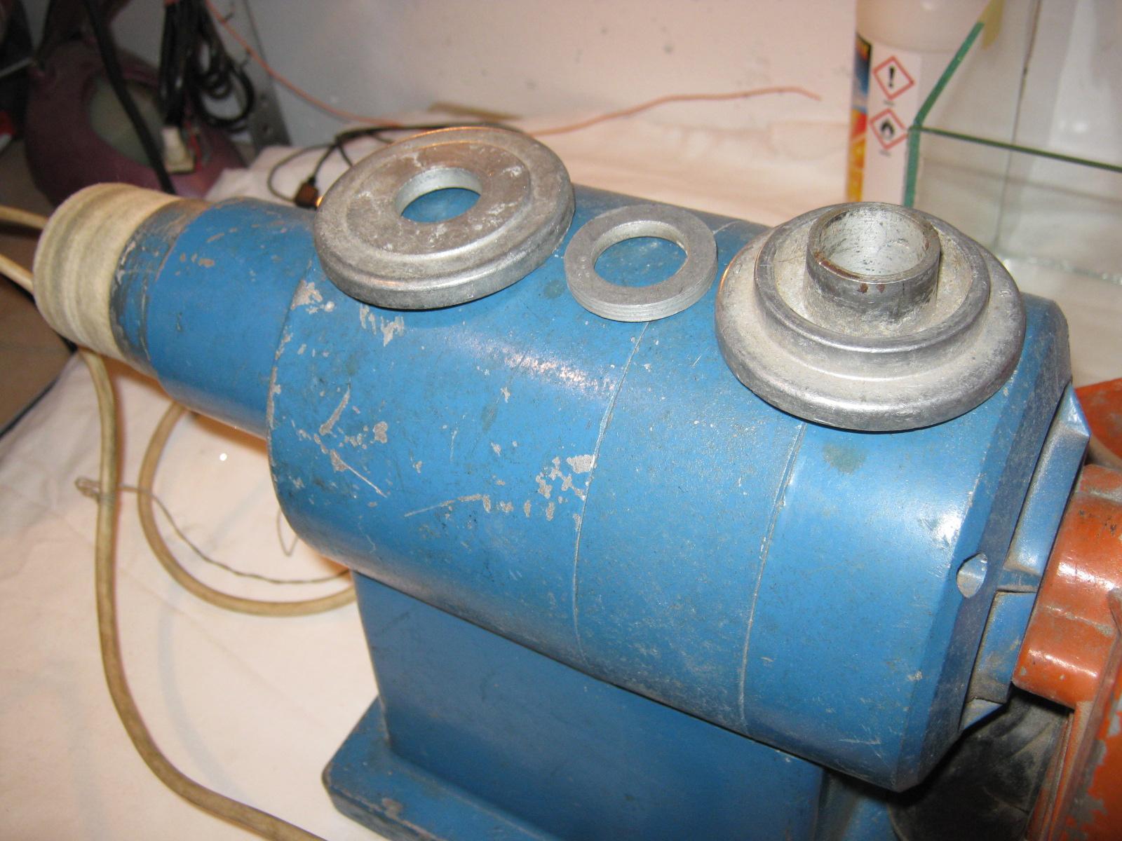 Odkręć śrubę , włóż dwa grubsze śrubokręty w miejsca gdzie są strzałki i próbuj podważyć , jak nie schodzi to pryśnij WD40 odczekaj i musi zejść . Miałem taką w modelarni na lotnisku i pracowała chyba z 10 lat , odszedłem to jeszcze była sprawna , jak mieliśmy problemy ze zdjęciem tarczy to tak robiliśmy !!!