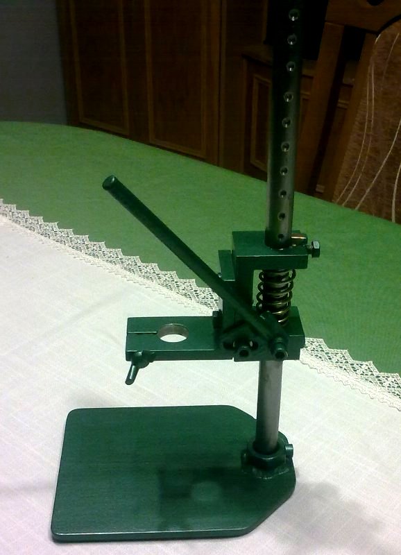 Witam. W ramach małego luzu w pracy zrobiłem sobie stojak do Proxona. Prosty, ale funkcjonalny no i darmocha. Wszystko z odpadów, kolumna z rurki grubościennej 14, wodziki z aluminium -frezowane kostki, podstawa z blachy stalowej 6, sprężyna dobrana ze sterty magazynowej.