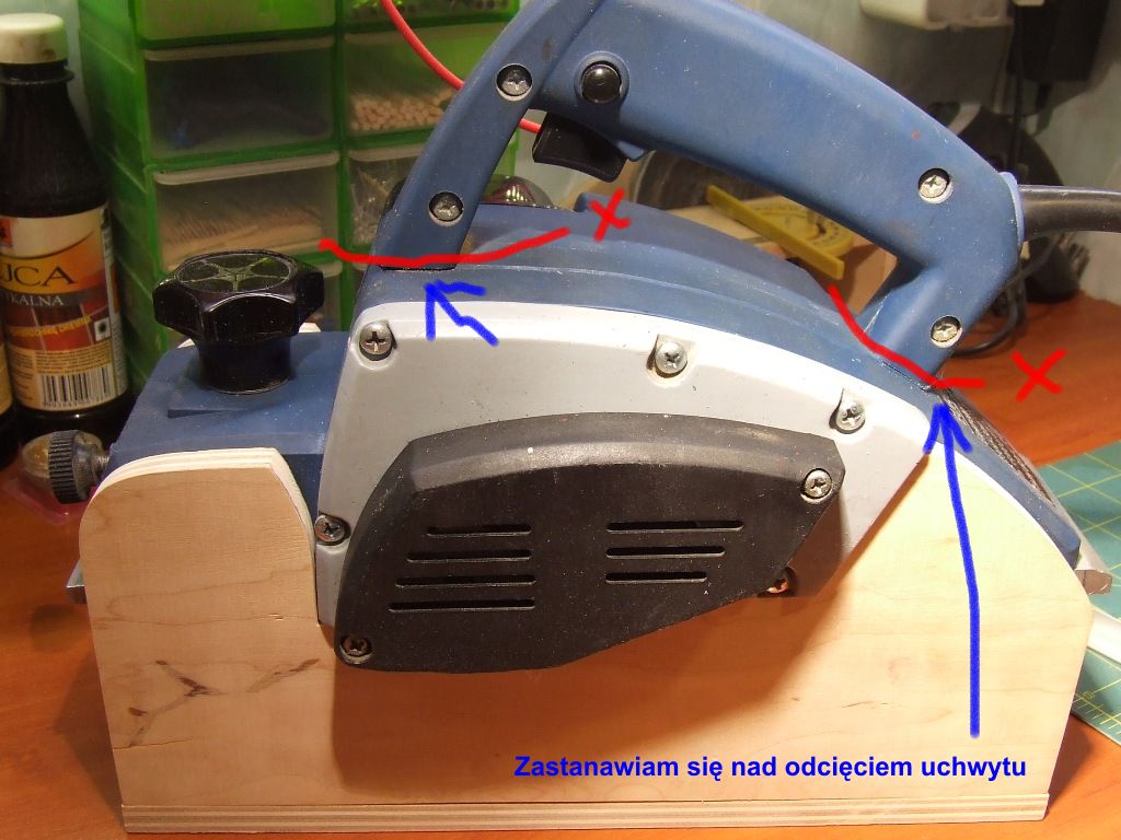 Witam.Napis ostrzegawczy dałbym w kolorze czerwonym.Większość stolarzy ma obcięte lub ostrugane paluszki.Uchwytu raczej bym nie obcinał, jak trzeba będzie cosik strugnąć niemodelarskiego to klapa.Przyjdzie kupić drugą strugarkę.Pozdrawiam.