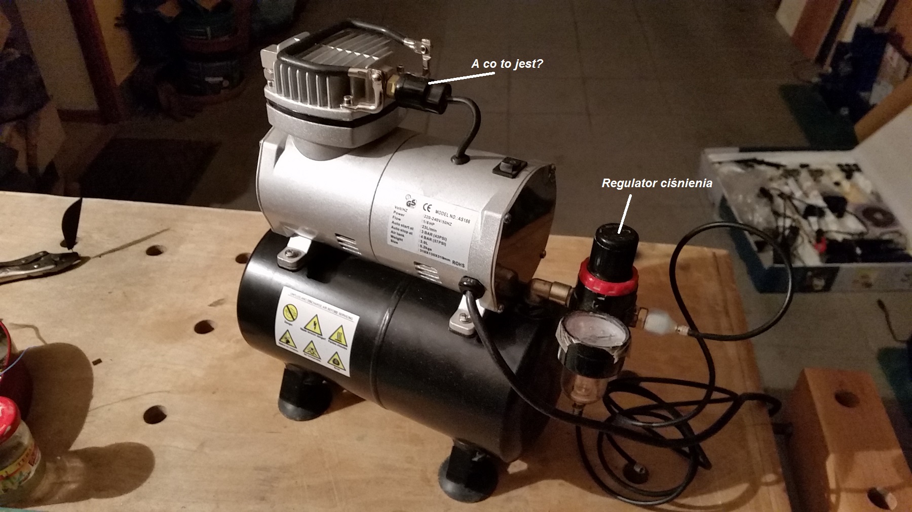 Od 3 lat tłoczę powietrze do aerografu takim oto kompresorkiem. Do wczoraj pracował uczciwie, ale się mu odechciało. Przedtem włączał się automatycznie przy 3 barach i wyłączał przy 4 barach. Teraz ani myśli. Chodzi nonstop. Przy 5 barach sam go wyłączam, bo mam stracha, że będzie “wielkie buuuum”.