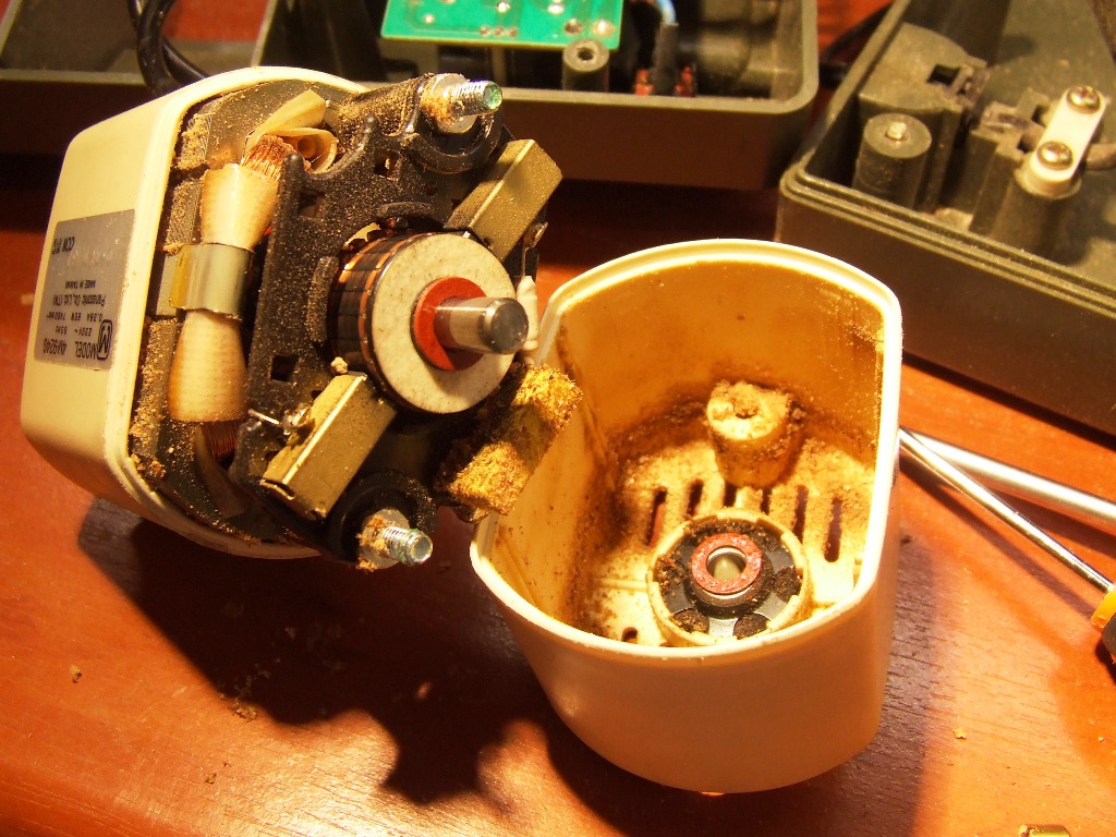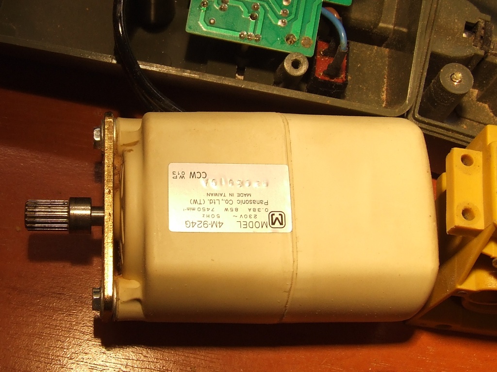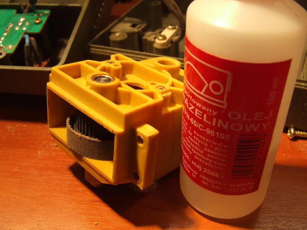 Pokazałem , ze rozkręcenie, przesmarowanie i ponowne złożenie nie jest trudne a warto to zrobić. Na fotkach masz pokazane jak to wygląda. Nie każdy widział rozkręcone wnętrze silnika w którym nagromadziło się sporo brudu. Przy okazji możesz zobaczyć, że z jednej strony silnika jest łożysko a z drugiej tuleja wymagająca przesmarowania. To samo dotyczy tulei w zespole wału mocującego tarczę tnącą. Tuleja w tym zespole była całkiem sucha i to było źródłem hałasu. Smarowanie odbyło się olejem załączonym na fotce. Opis chyba zbędny. Drobne trociny i pył drzewny mają to do siebie, że osuszają tuleje i po pewnym czasie cały zespół napędowy zaczyna hałasować. Wymaga to smarowania.