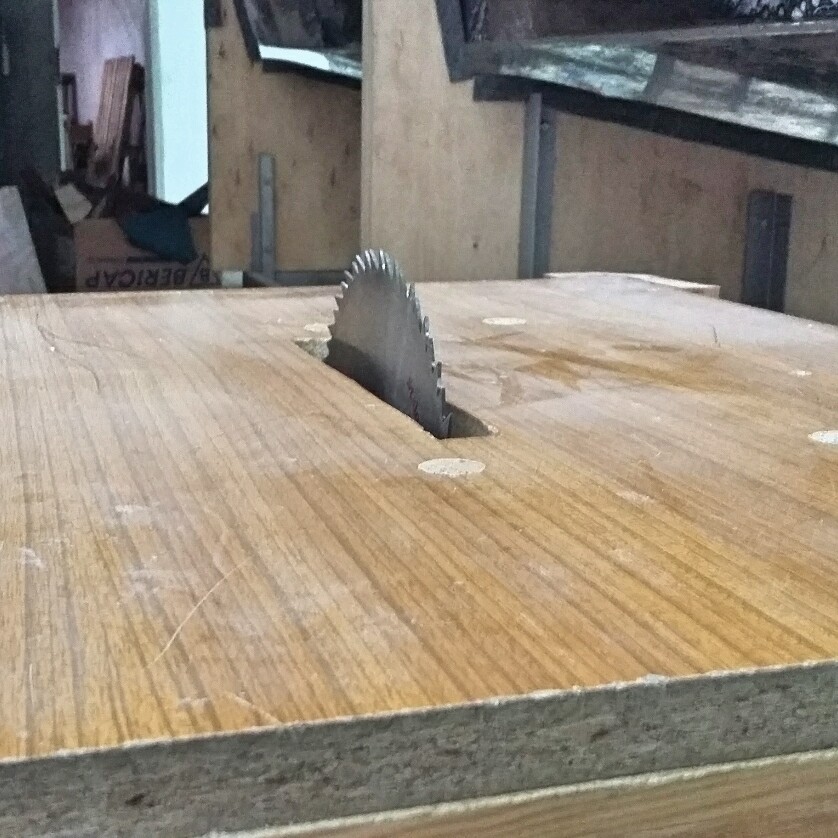 Pomysł dobry, tylko wykonanie niepoprawne. W tej postaci, ta piła nadaje się do cięcia drewna na opał. Dlaczego? Już wyjaśniam. Blat z płyty paździerzowej jest zbyt gruby, zabiera wiele cennej wysokości roboczej. Sklejka o gr. nie mniejszej niż 8 mm w zupełności wystarcza. Drugi błąd i to kardynalny to szczelina na tarczę. W tym przypadku ruchoma osłona tarczy powinna być schowana pod blatem, a nad blat wystawać sama tarcza. Szczelina powinna być ciut szersza od grubości piły czyli jej rzazu. A to dlatego, że podczas cięcia przy Twojej szczelinie zęby będą wyrywać włókna drewna nie podparte od spodu. Długość szczeliny powinna też być nie dłuższa niż długość wystającej piły ponad blat. Tuż za piłą powinien być umieszczony klin rozdzielający o grubości ciut większej niż rzaz. Powinna też być osłona zakrywająca zęby od góry. Chyba, że będziesz do cięcia zakładał okulary ochronne. Jeżeli masz zamiar zmienić blat, to warto moje uwagi wziąć pod uwagę.