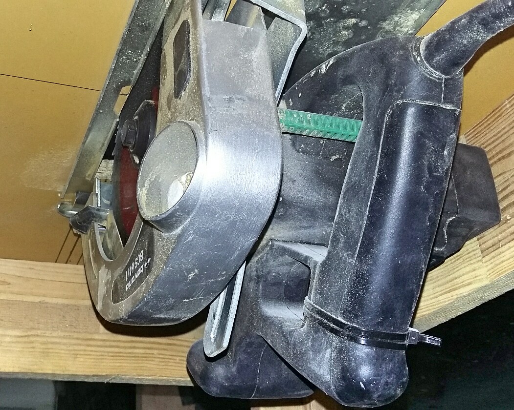 Jest to piła elektryczna ręczna przykręcona do blatu od spodu. Nie miałem na czym ciąć więc zmajstrowałem coś takiego.