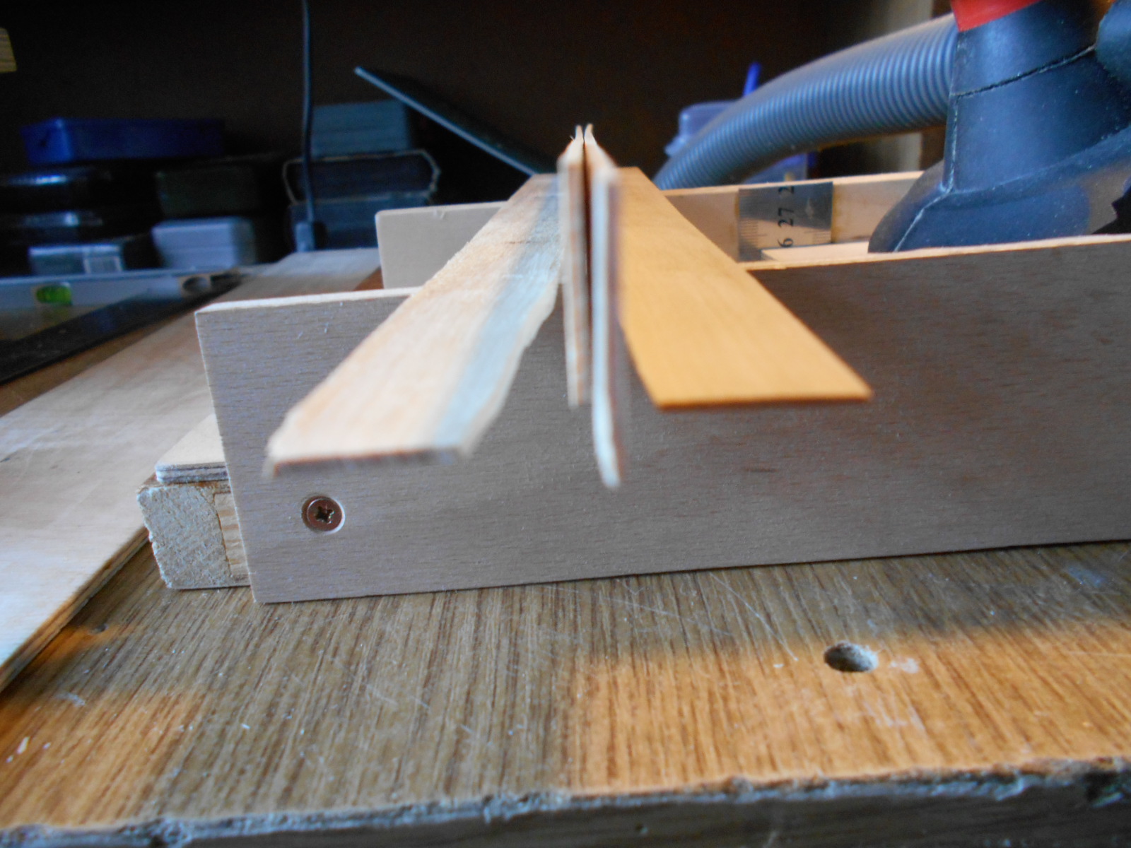 w miarę potrzeb warsztacik rośnie. Do swego modeliku muszę zrobić deseczki na poszycie pokładu . Przyciąłem parę listew z deski brzozowej od Mariana. Trzeba je troszkę oszlifować po wycięciu. Nie dysponuję jeszcze takim urządzeniem jak szlifierka bębnowa , ale mam strug ręczny. Wykombinowałem coś na wzór grubościówki go strugania listewek. Na razie wystrugałem wstępnie listewki o grubości 1,5 mm na tym "urządzeniu". Czyli zdaje egzamin.