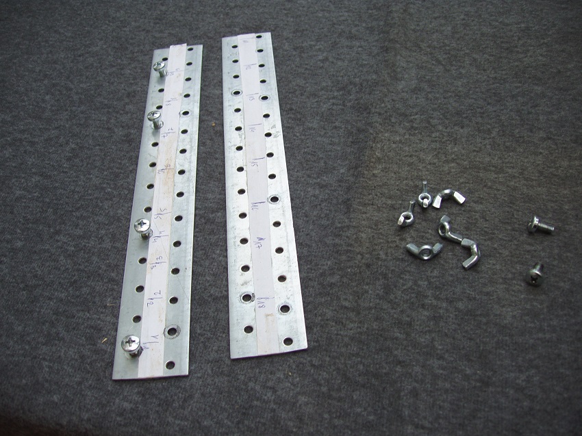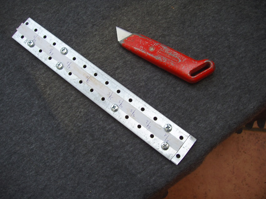 Samo narzędzie jest bardzo proste i składa się z dwóch blach długości 30 cm i grubości 2 mm z otworami fi 5 mm oraz sześciu śrub fi 5 mm z nakrętkami motylkowymi.Obrabianą plankę mocujemy między blachami i zaciskamy śrubami. Zwężanie listewek odbywa się poprzez kilkukrotne przeciąganie nożykiem czy skalpelem po krawędzi jak cięcie przy linijce.