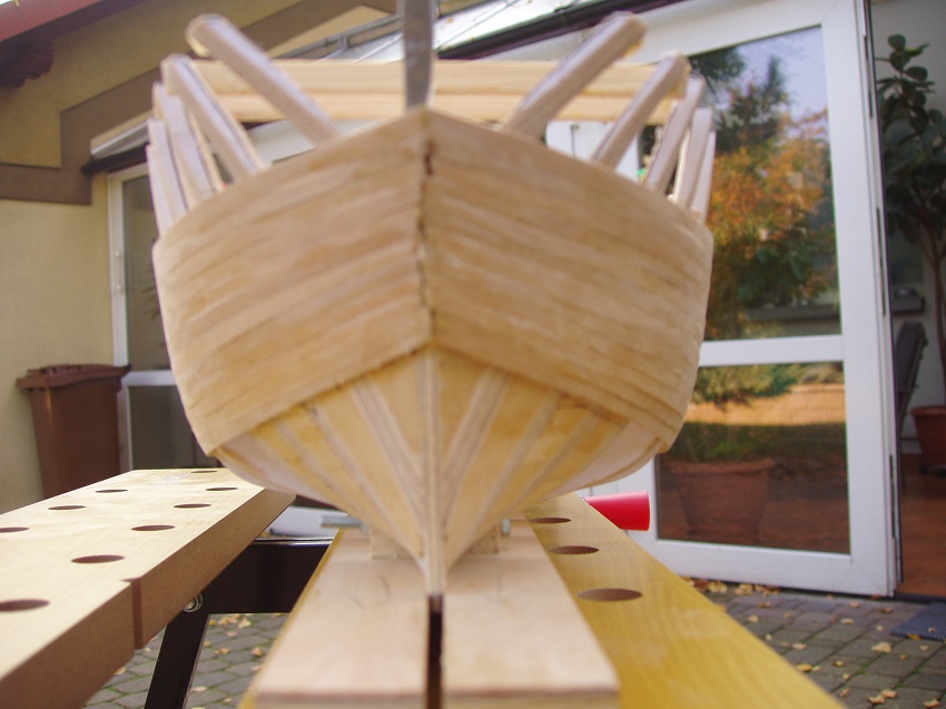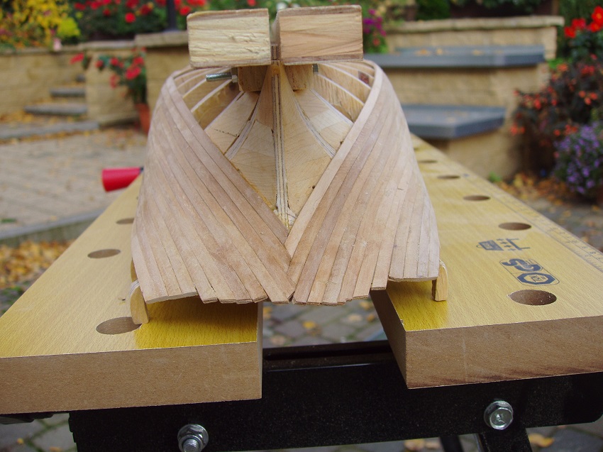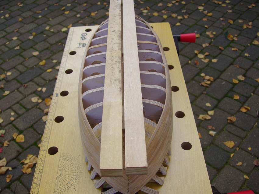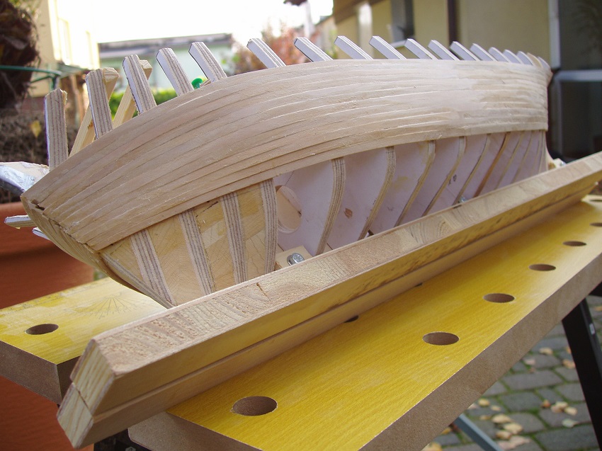 1. Dzięki wielopunktowemu mocowaniu listewki istnieje możliwość jej ugięcia i wycięcia po łuku bo kadłub nie jest częścią prostego stożka a bardziej podobny do bochenka chleba jak zauważył TomekA. Takiej możliwości nie daje struganie hebelkiem.