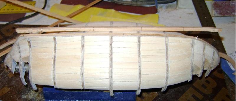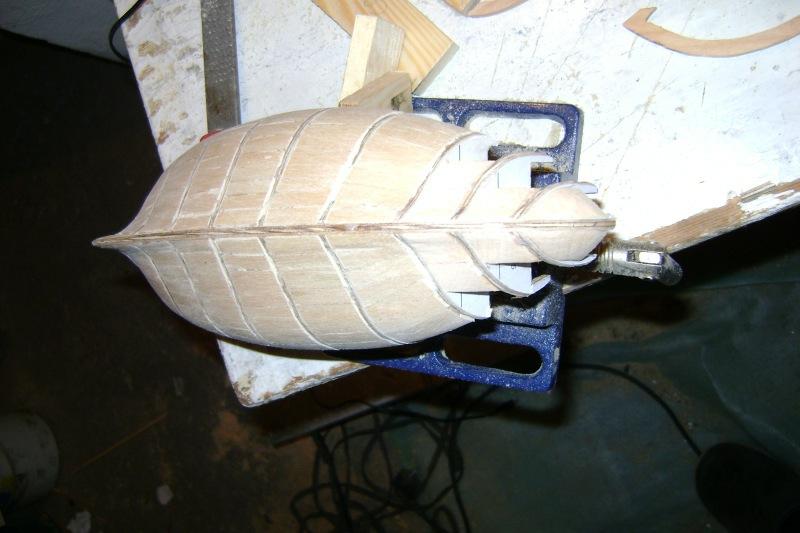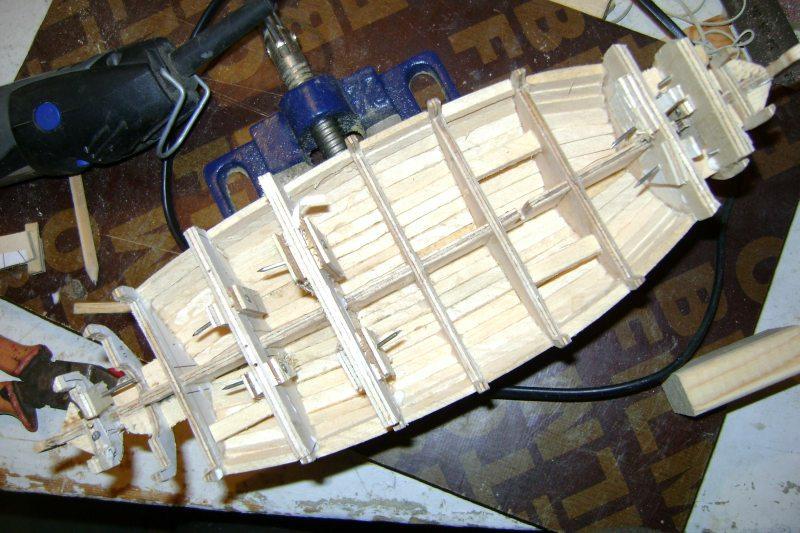 Będę kontynuował poszczególne Kroki a tu równolegle pokazywał etapy z budowy. Chwilowo chyba za wiele nie ma co pisać. Po wykonaniu stoczni z niewielkimi modyfikacjami wyciąłem wręgi i szkielet w sklejce 4 mm oraz falspokład w sklejce 1 mm. Całość z grubsza oszlifowałem i skleiłem do kupy. Z drzewa czereśniowego wyciąłem kil i stewy - chwilowo czekają na zamocowanie. Stwierdziłem że w celu wzmocnienia konstrukcji a także dla wygody poszywania wypełnię międzywręgi beleczkami olchowymi które następnie wyszlifuję. Tak też i zrobiłem. Następnie zamocowałem kadłub w imadle i dawaj go raszplować i szlifować. I myślę że zostanę przy tym przez kilka dni ;]