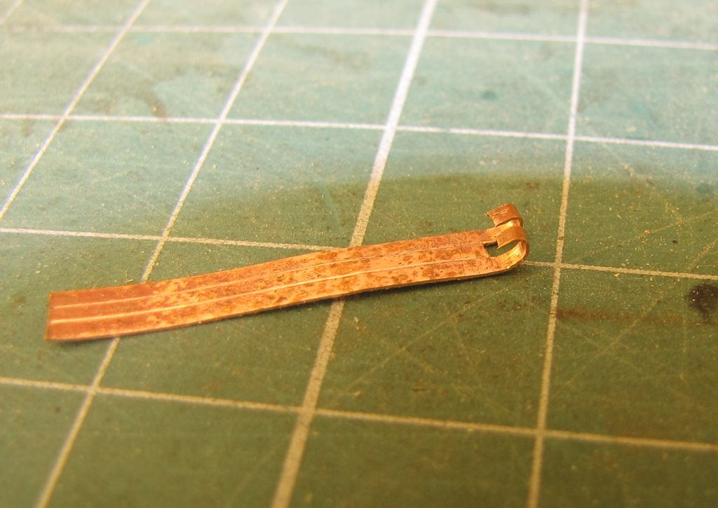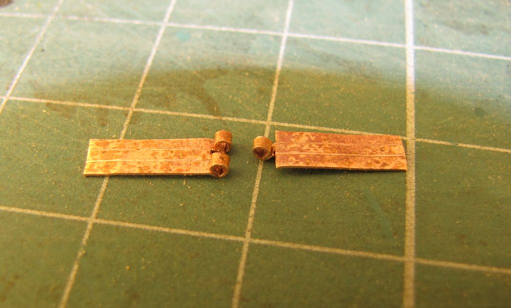 Kolego zawiasy szajs nie samowity, podklej tą cieniutką blaczkę na kawałek czegoś twardego klejem ca potem wytni to włośnicą równo i odklej. Nalklej to na właściwy luk i miejsce potem nawierć otworki 0.5mm wciśni drut i przytni go tak by odrobinę wystawał i będzie imitował łeb. Bo jak myślę to te zawiasy nie są ruchome i nie mają takie być. :D :D :D