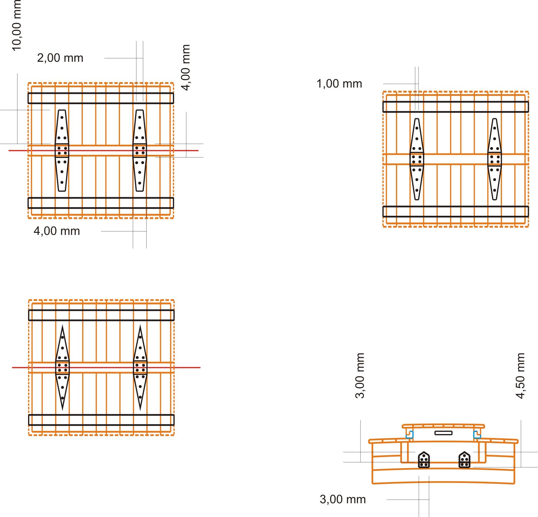 Ok, o to jest jpg z nadbudówkami, zawiasami i wymiarami. Założenie jest takie, żeby te zawiasy zrobić z blaszki 0.3 mm. Dodatkowe założenie (jakkolwiek kompletnie nieprzydatne w tym przypadku) to to, żeby zawiasy były ruchome. W związku z powyższym nasuwają się pytania: