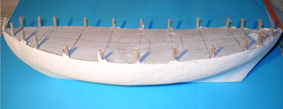 Pod powyższym masz rozważania na temat ilości planek w miejscu rufy, dziobu oraz śródokręcia. Liczby te nie uwzględniają nadburcia, które powinno mieć wysokość 0.5m - przelicz sobie w skali ile to będzie i ile listewek.