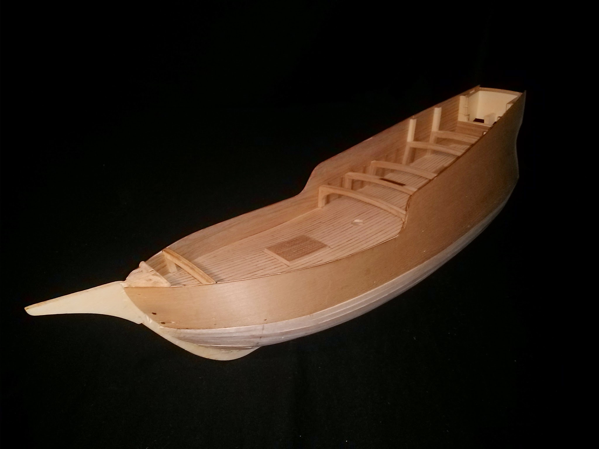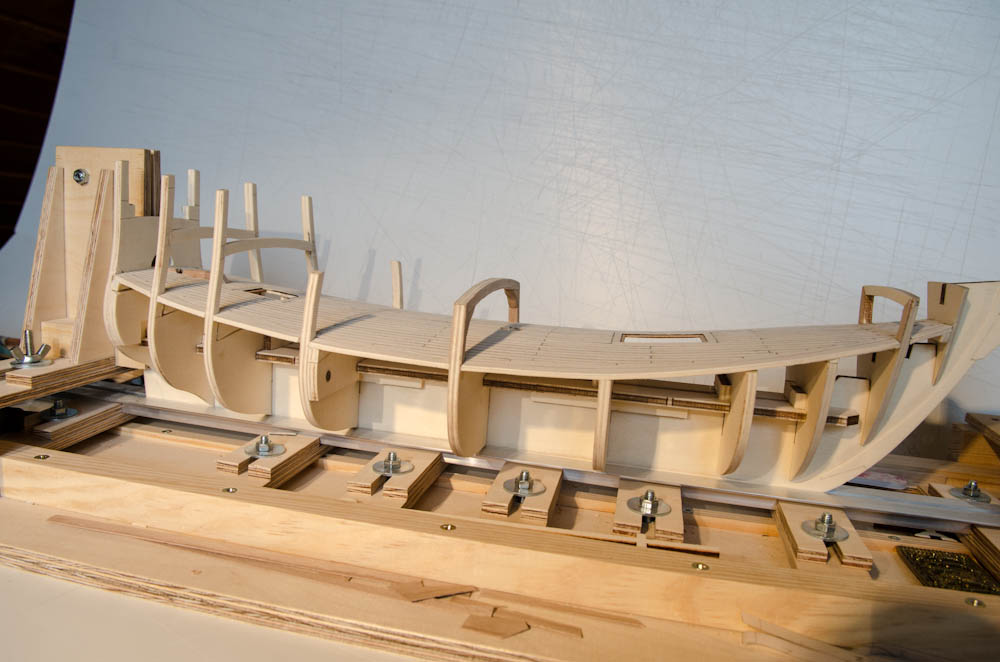 Przechodząc do sprawy Santa Marii, pokład główny ostatnio został zerwany, teraz położony jest podkład nowego. Linia pokładu przebiega łagodnie od dziobu po rufę podnosząc się na końcach, myślę, że efekt jest zadowalający ( już nie mogę się doczekać, jak będzie skończony z deskowaniem ).