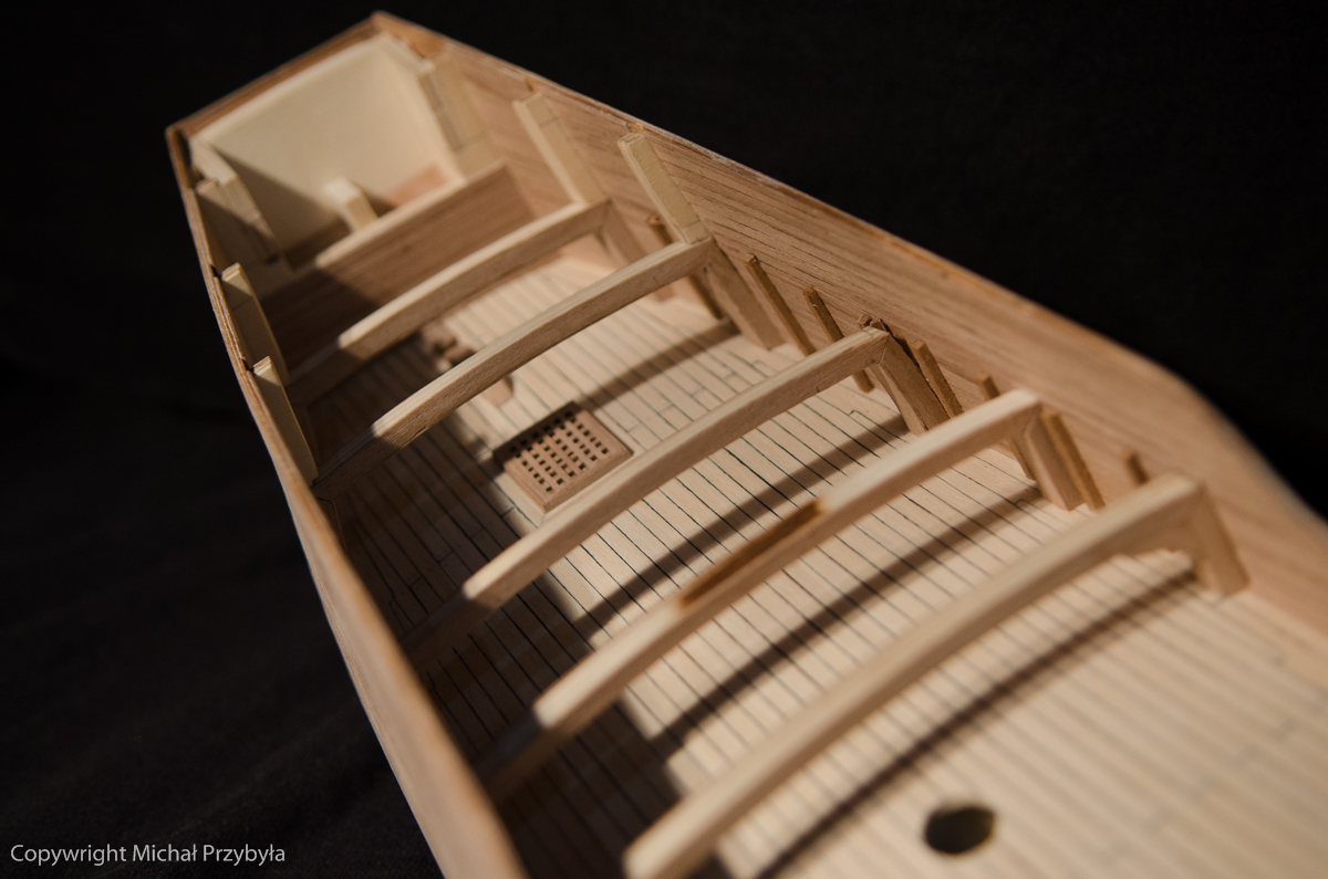 Po przebudowaniu pokładu głównego - odpowiednim wyprofilowaniu położyłem pokład z forniru brzozowego imitacja uszczelnienia wykonana techniką markera.