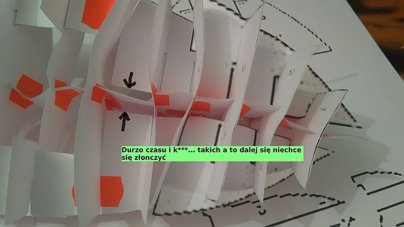 O ile mój znajomy mający dostęp do wielkoformatowego wydruku, plany SM ładnie wydrukował w A1 dzieląc PDF (dwie strony) na 4 arkusze A1, o tyle szablony z wycinanki kadłuba w A3 powiększenie o 200% , wyszło mu na A1.