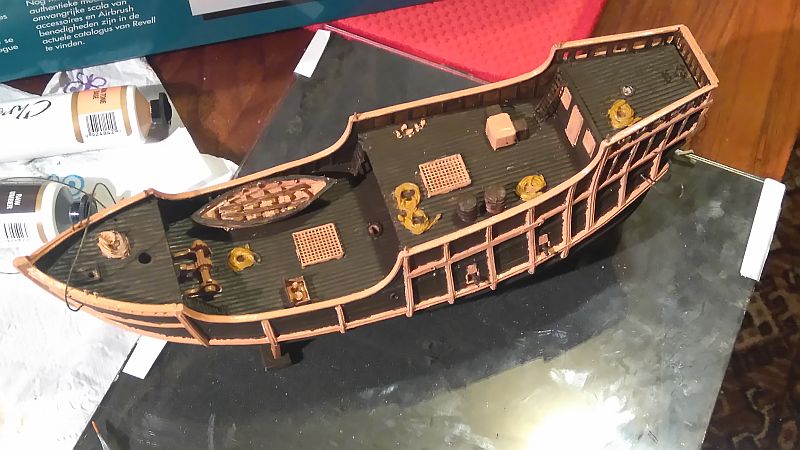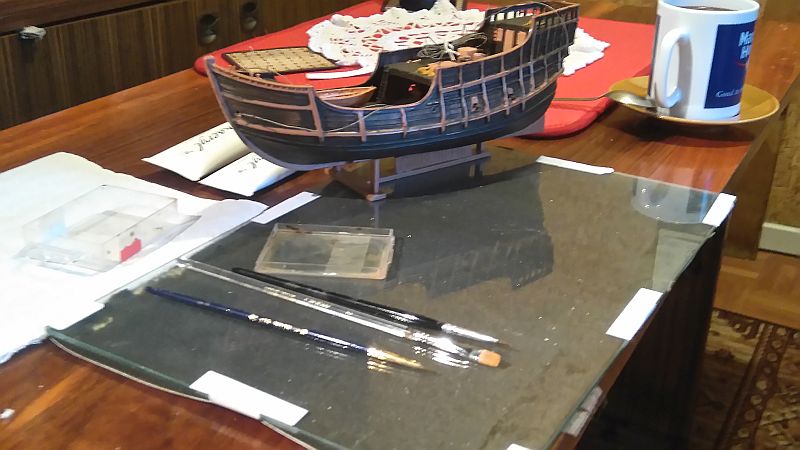 Pomalowałem w całkowitym uproszczeniu kadłub, 3 kolory (takie miałem), teraz dopiero widzę dlaczego pokład powinien być jaśniejszy od poszycia kadłuba.